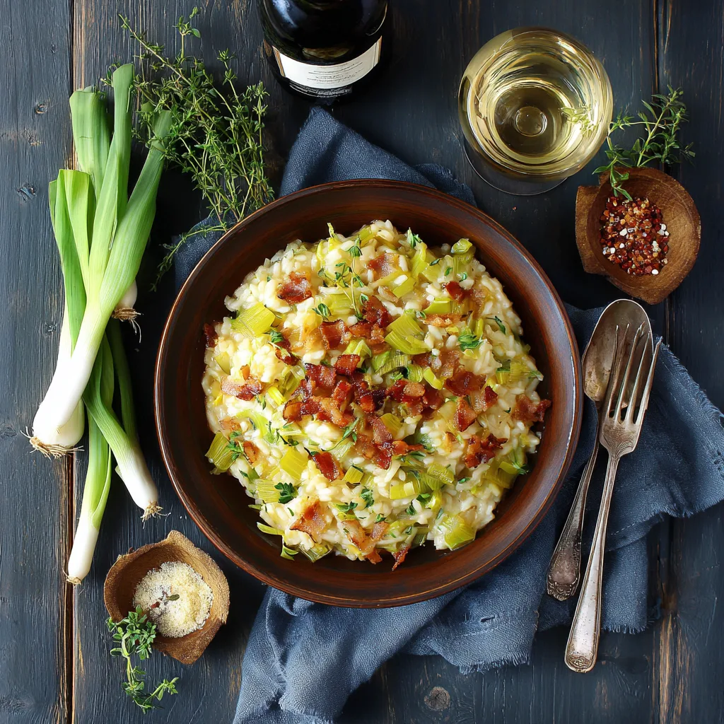 Creamy Italian-style risotto with smoky bacon and tender leeks, perfect comfort food.