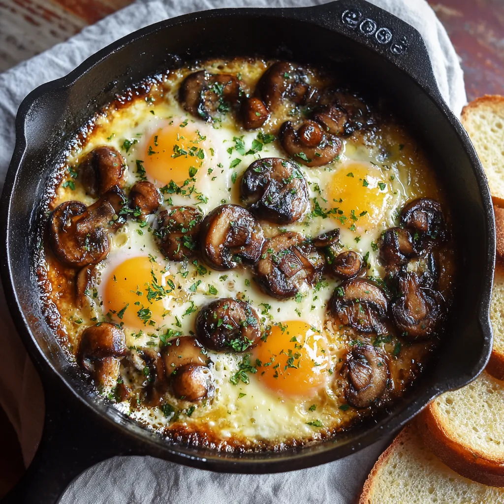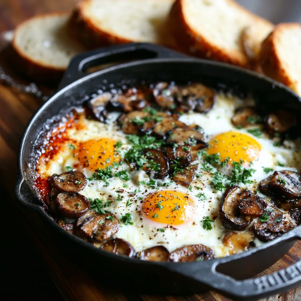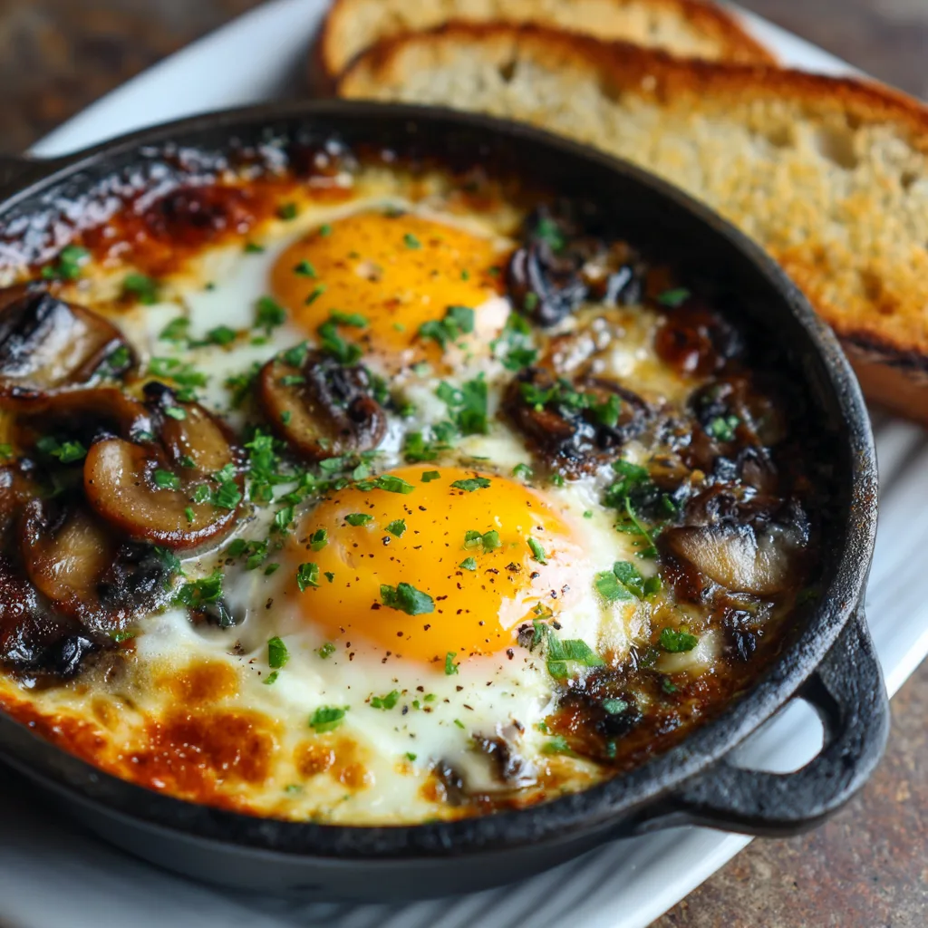 The beauty of this recipe lies in contrast: tender mushrooms sautéed until deeply golden, infused with garlic and herbs, topped with eggs that bake gently until the whites are set and the yolks remain luxuriously soft. Served straight from the oven, bubbling and aromatic, this dish is a celebration of savory simplicity.