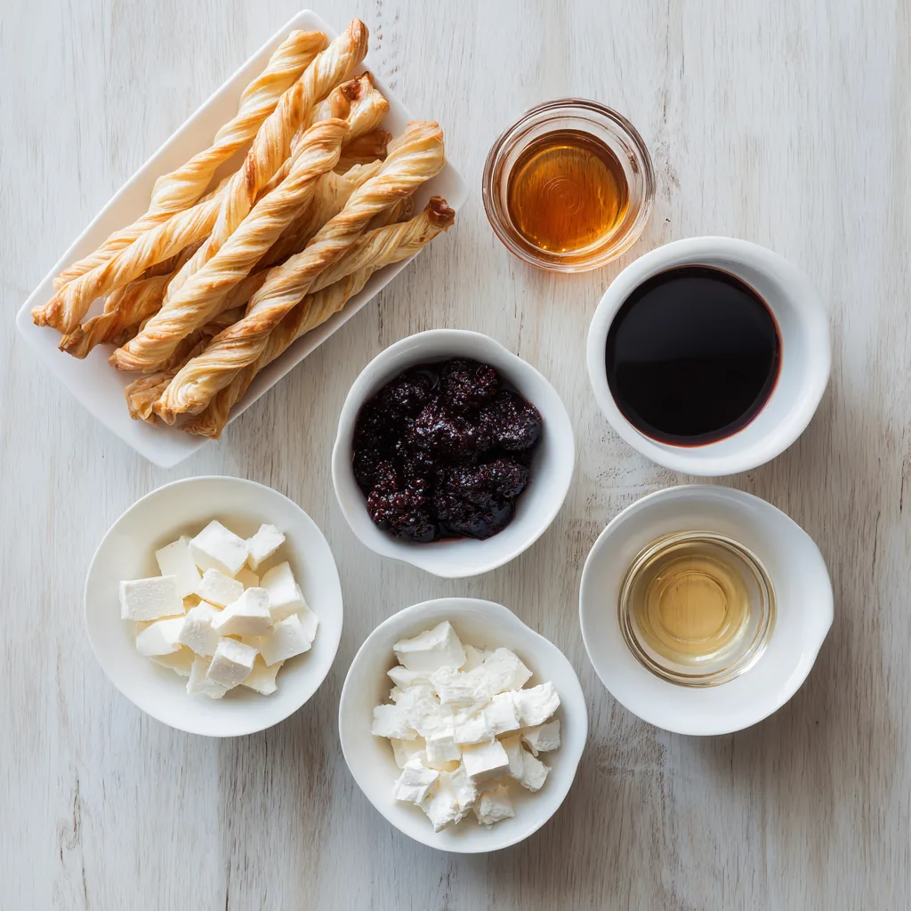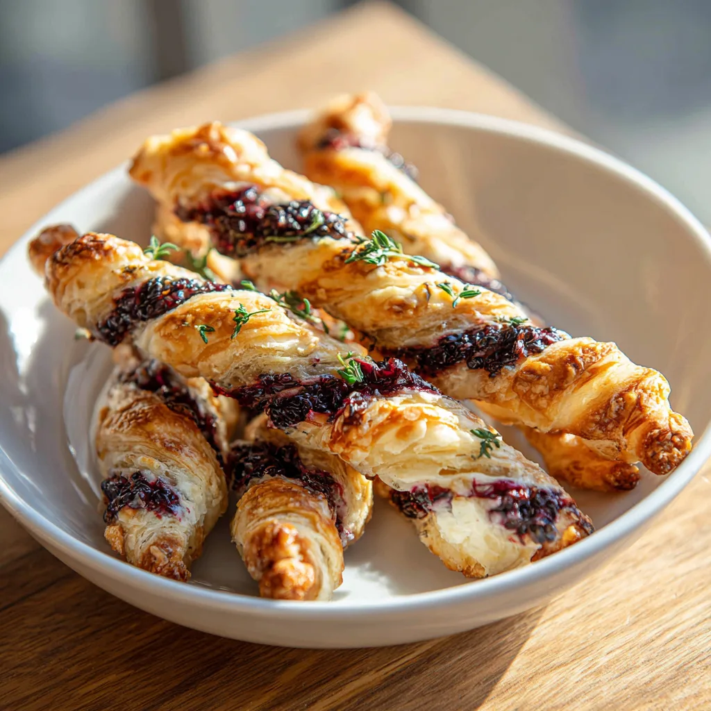 Flaky puff pastry twists filled with creamy goat cheese and sweet blackberry preserves, perfect for elegant appetizers or brunch.