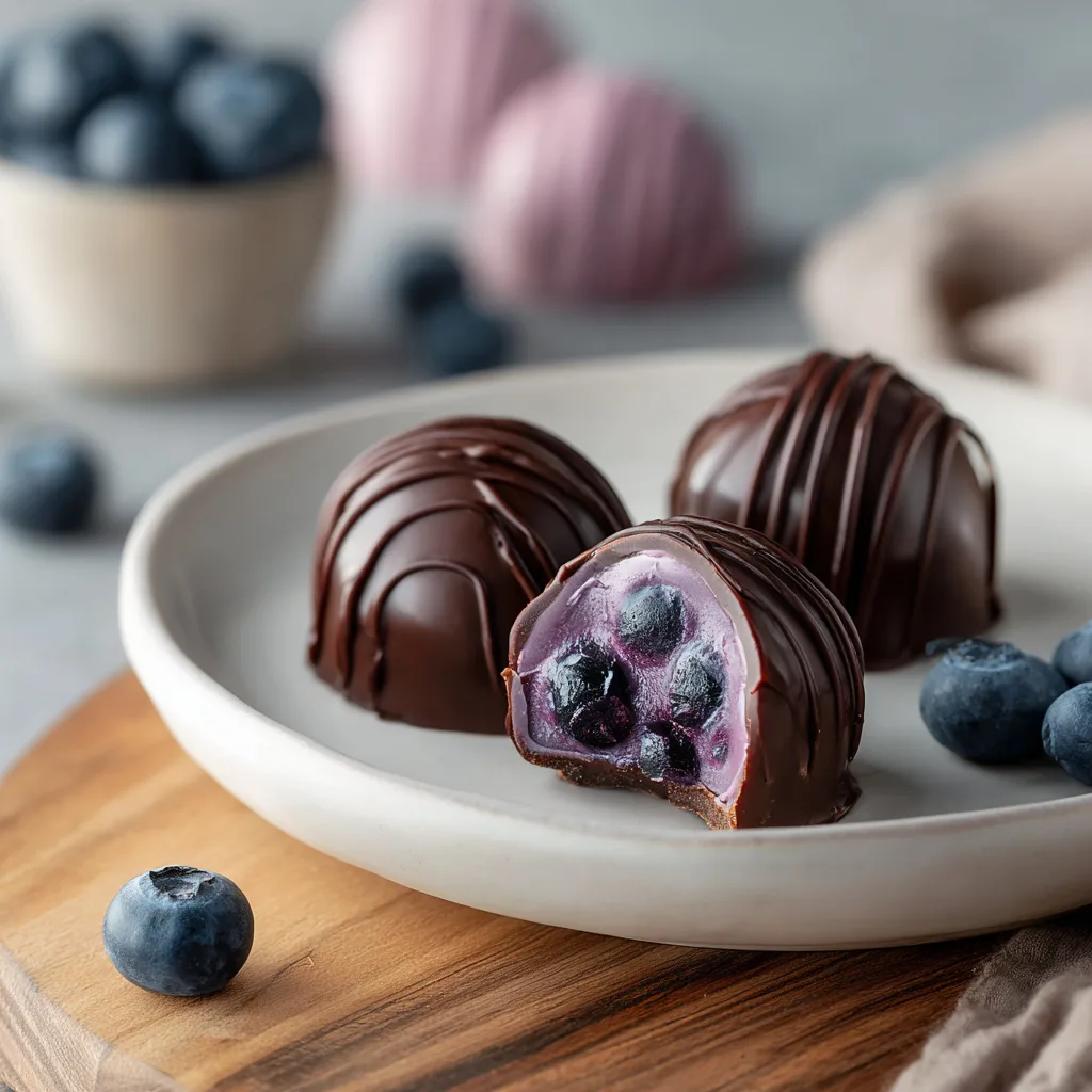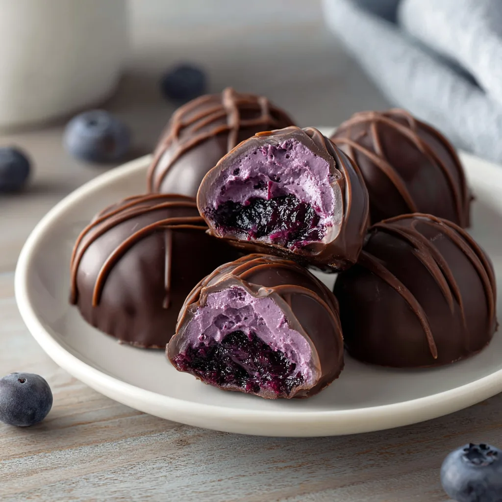 Imagine biting into a glossy chocolate shell that gently cracks to reveal a soft, blueberry-scented buttercream center. Each bite offers a delicate balance between creamy sweetness and fresh berry brightness.