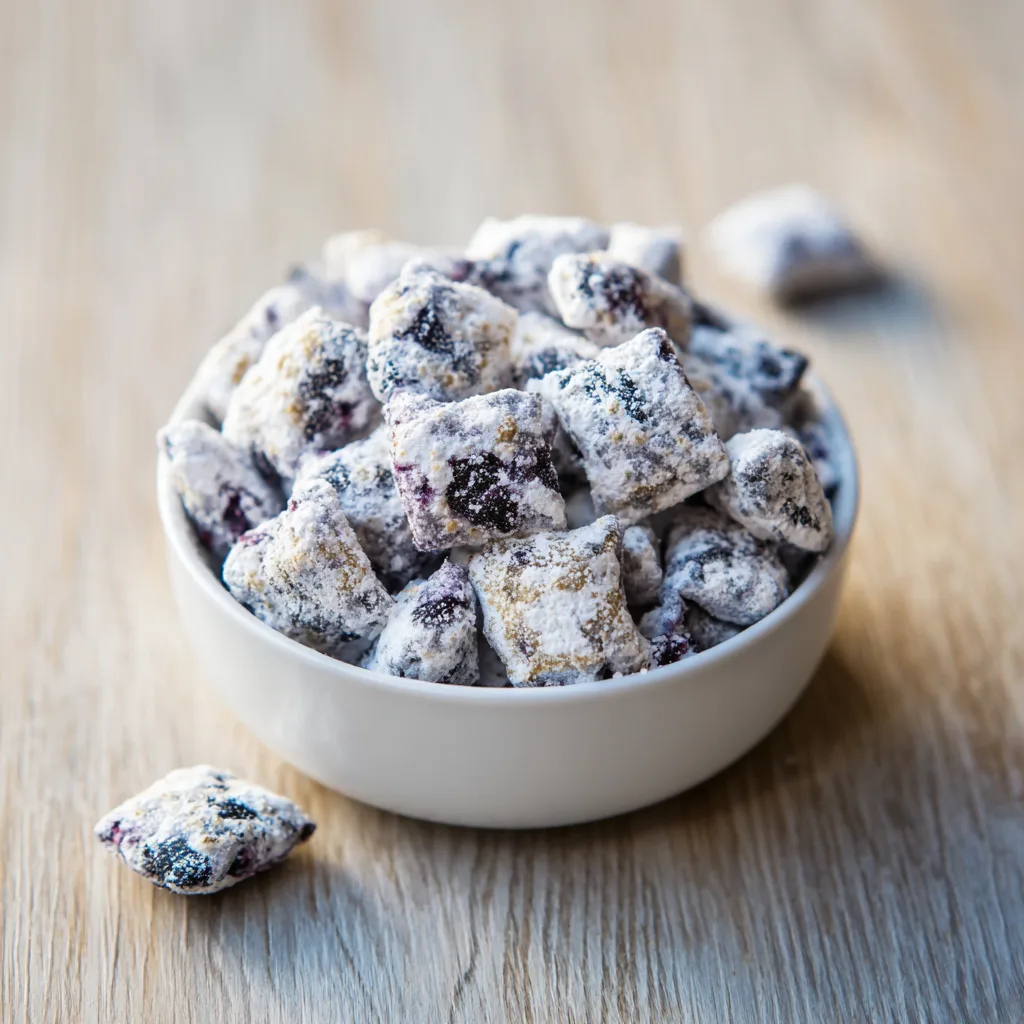 This puppy chow is creamy, citrusy, crunchy, and lightly fruity. The lemon brightens the sweetness, while the cream cheese gives it that unmistakable cheesecake richness. Freeze-dried blueberries add intense flavor without moisture, keeping everything crisp.