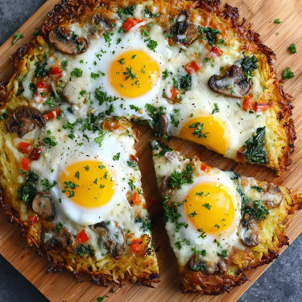 A hearty breakfast pizza made with a crispy hash brown crust, topped with melted cheese, savory breakfast meats, and baked eggs.