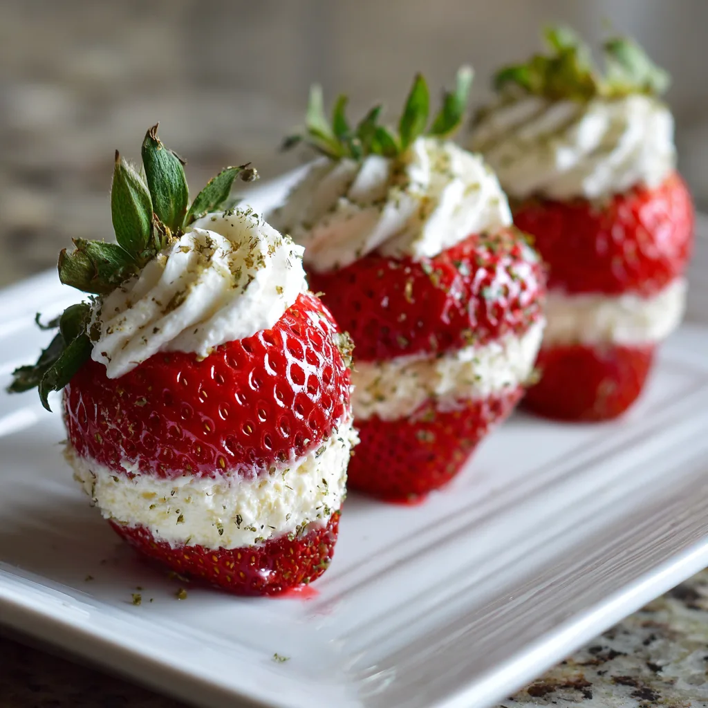 Fresh strawberries filled with creamy no-bake cheesecake filling, perfect for romantic desserts and special occasions.
