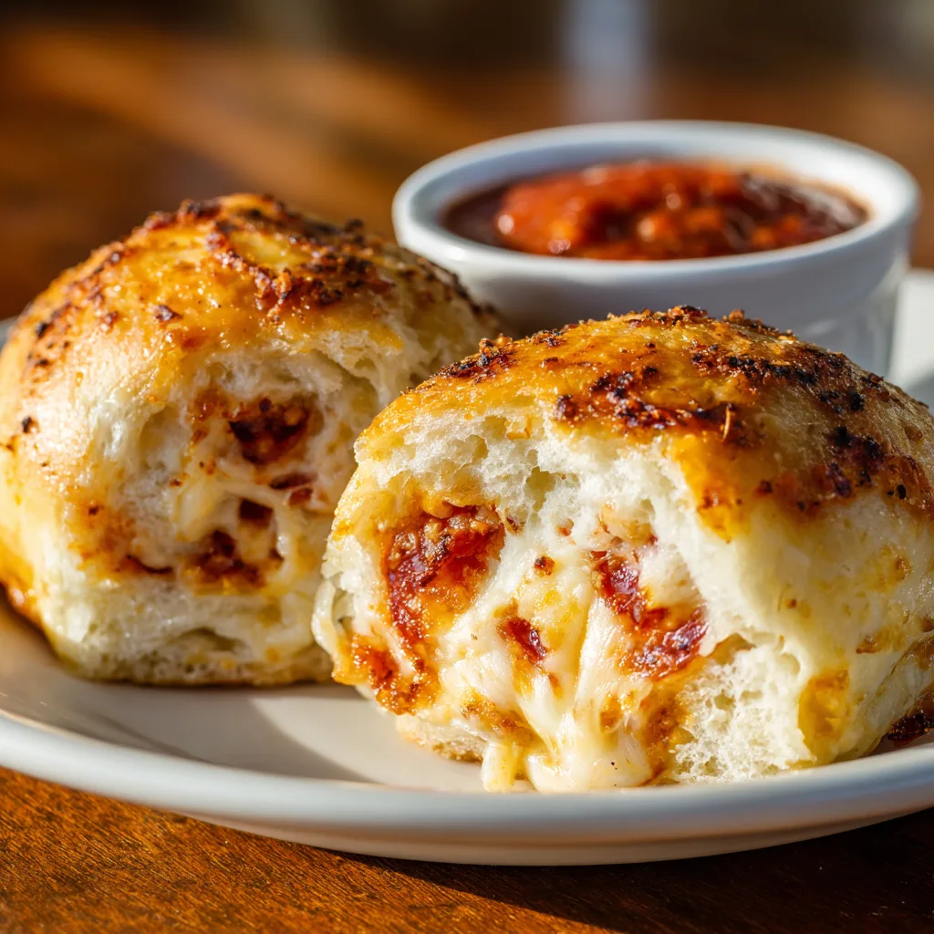 Soft baked pepperoni rolls filled with gooey cheese and served with marinara sauce for dipping.