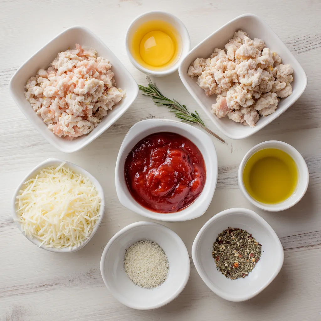 - In a large mixing bowl, combine the ground chicken, egg, Parmesan cheese, garlic powder, Italian seasoning, salt, and black pepper. Mix thoroughly until fully combined.