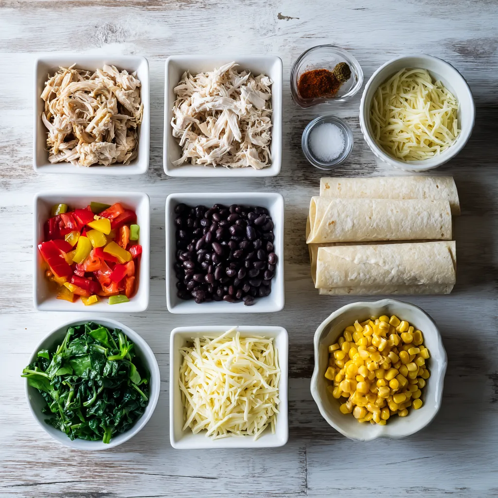 - In a large bowl, combine shredded chicken, black beans, corn, bell pepper, spinach, cheese, and all spices.
