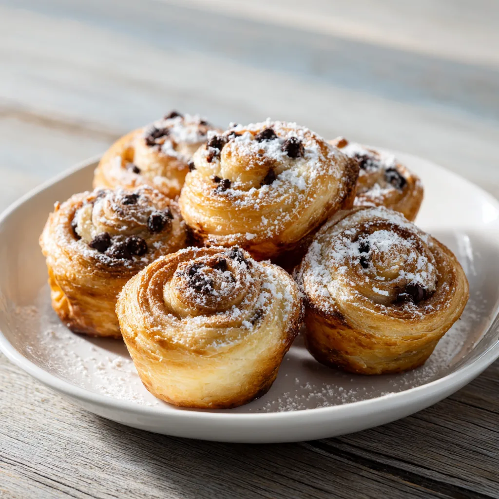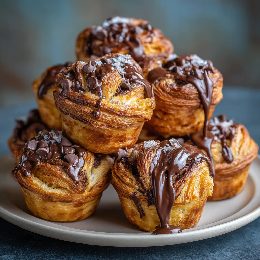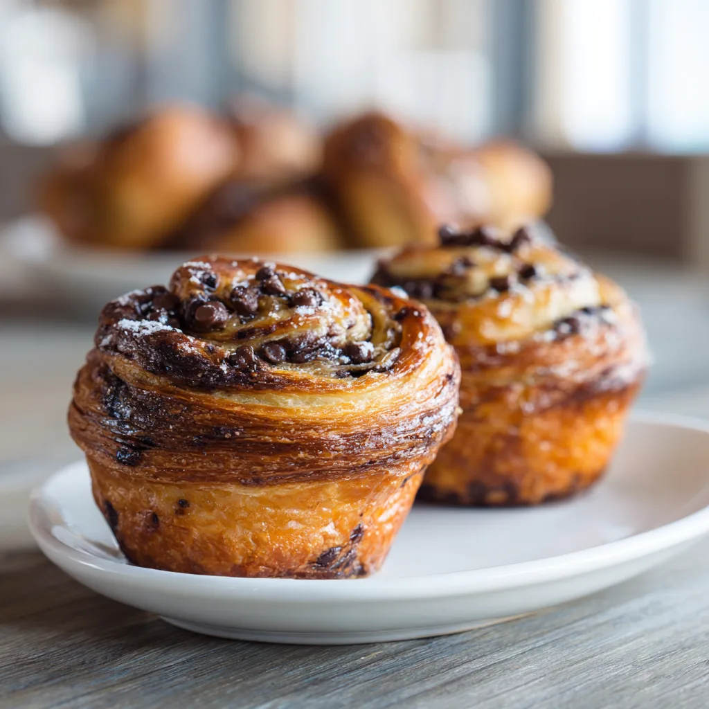 Flaky croissant-style muffins filled with melty chocolate chips, baked to golden perfection for a bakery-style treat at home.
