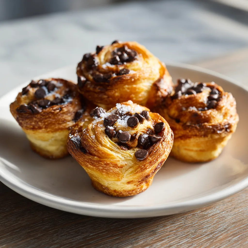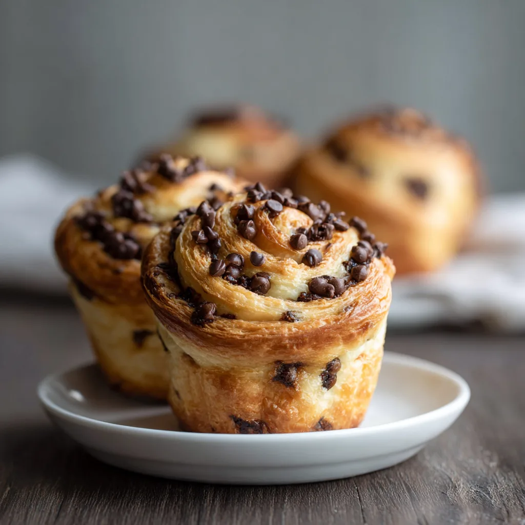 Imagine the flaky, buttery layers of a croissant baked into the shape of a tall, golden muffin. Now imagine those delicate layers filled with melty chocolate chips that create pockets of sweetness in every bite. The result is a pastry that’s crisp on the outside, soft on the inside, and absolutely irresistible.