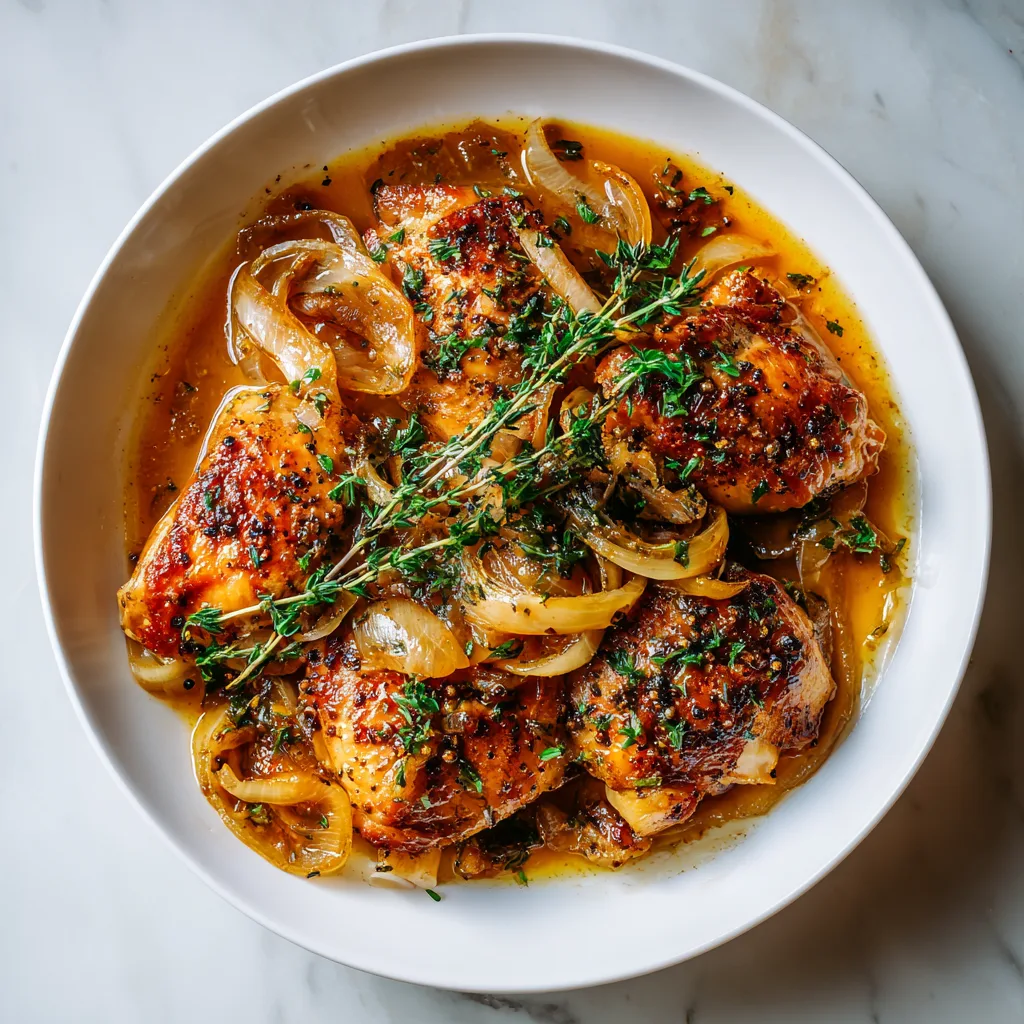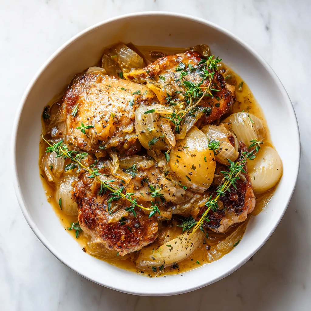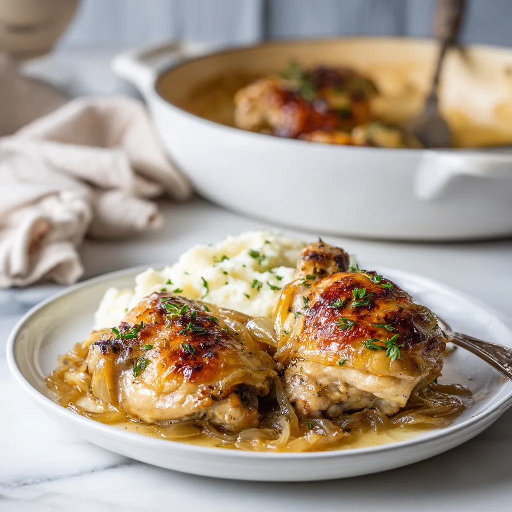 Braising allows the chicken to absorb the natural sweetness of apple cider while remaining juicy and tender. As the onions slowly cook, they transform into soft, golden strands that enrich the sauce and complement the savory notes of the chicken. The result is a dish that feels elegant without being complicated.