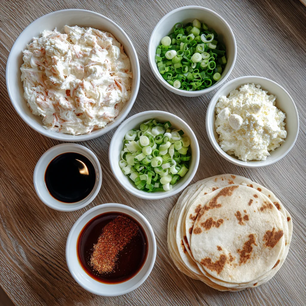 - In a bowl, mix cream cheese, crab meat, green onions, garlic powder, soy sauce, sugar, and pepper until smooth.