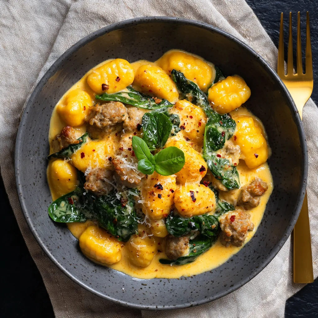 Soft gnocchi tossed in a creamy roasted butternut squash sauce with savory Italian sausage.