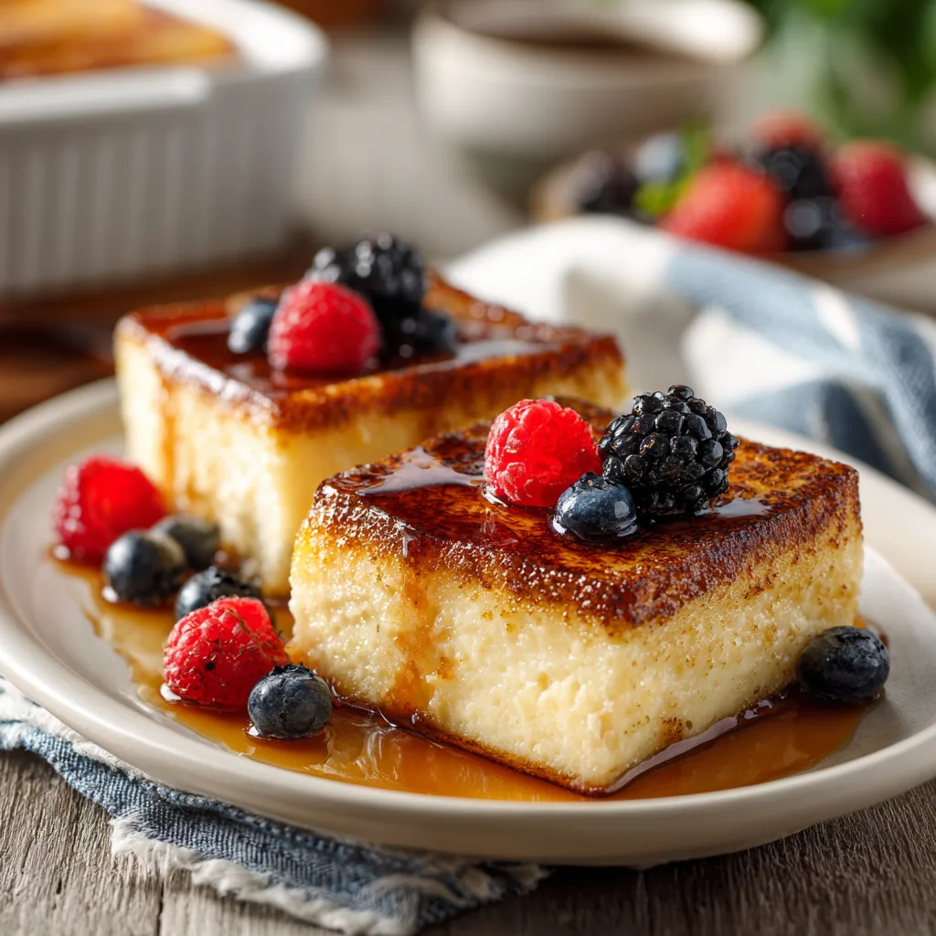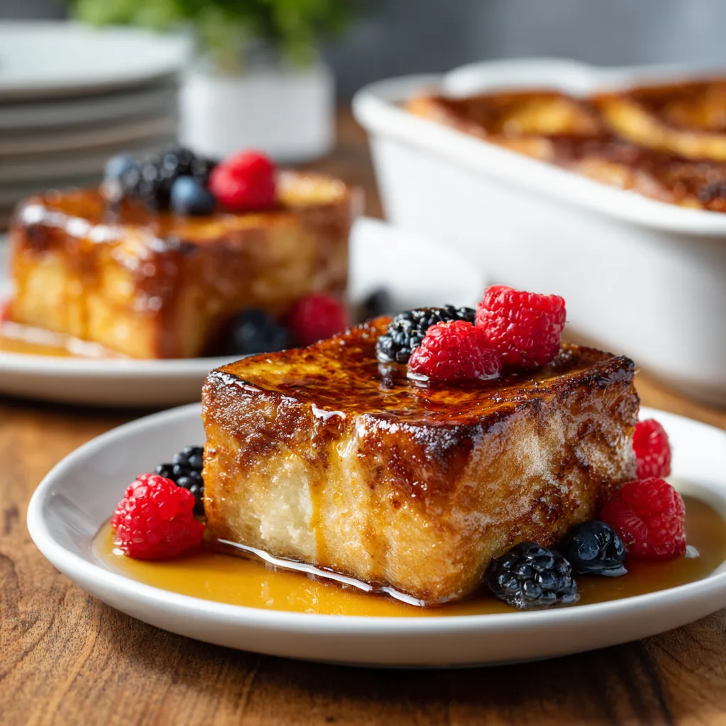 This recipe transforms humble ingredients — bread, eggs, cream, sugar — into a showstopping baked masterpiece. Inspired by the silky elegance of classic crème brûlée, this breakfast casserole features a buttery caramel base that melts into the bread as it bakes, creating an irresistible sticky glaze.
