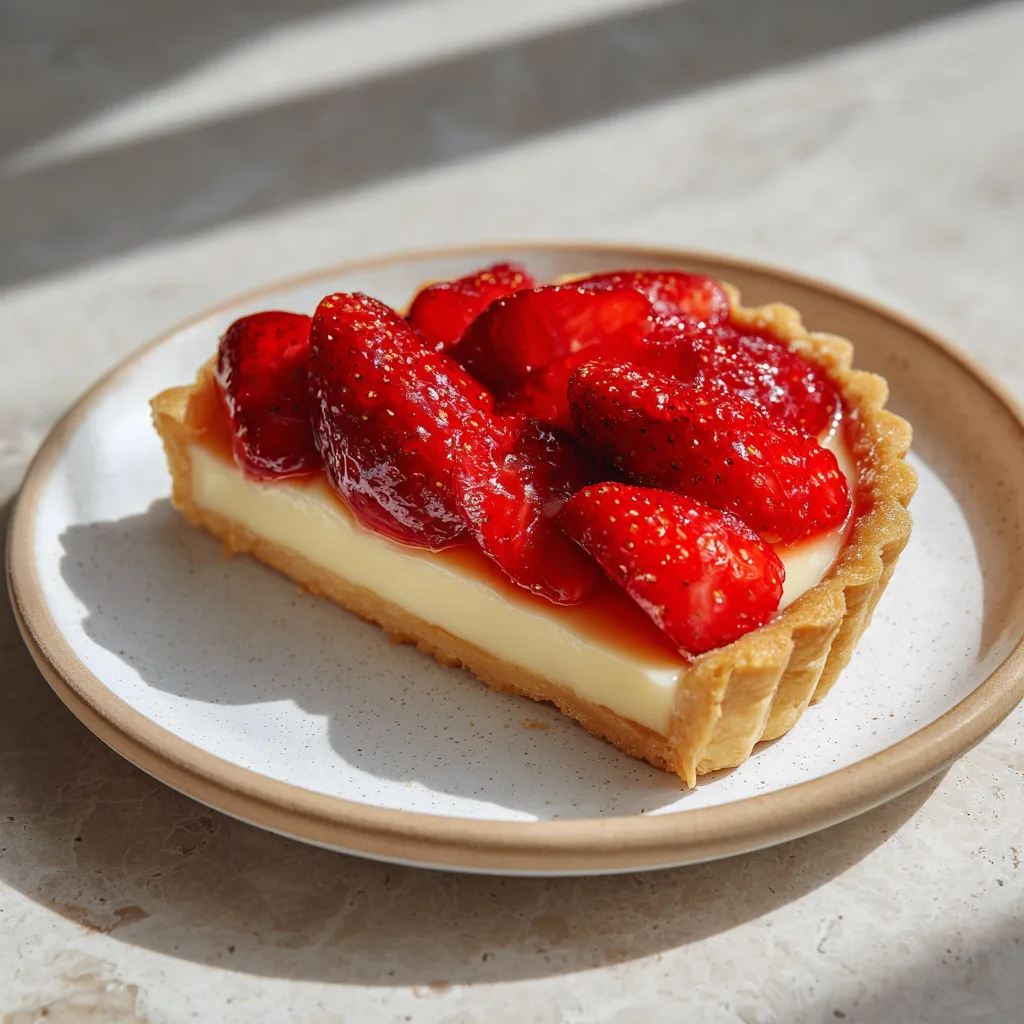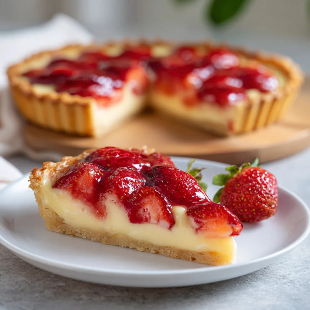 A classic summer dessert featuring buttery tart crust, silky vanilla custard, and fresh glazed strawberries.