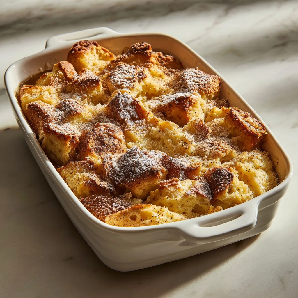 What makes this version special is the use of eggnog in place of standard milk or cream. Eggnog already contains eggs, cream, sugar, and spices, making it the perfect all-in-one base for a luxurious bread pudding. When baked, it transforms into a velvety custard with subtle notes of nutmeg and vanilla, perfectly balanced by a lightly crisp, golden top.
