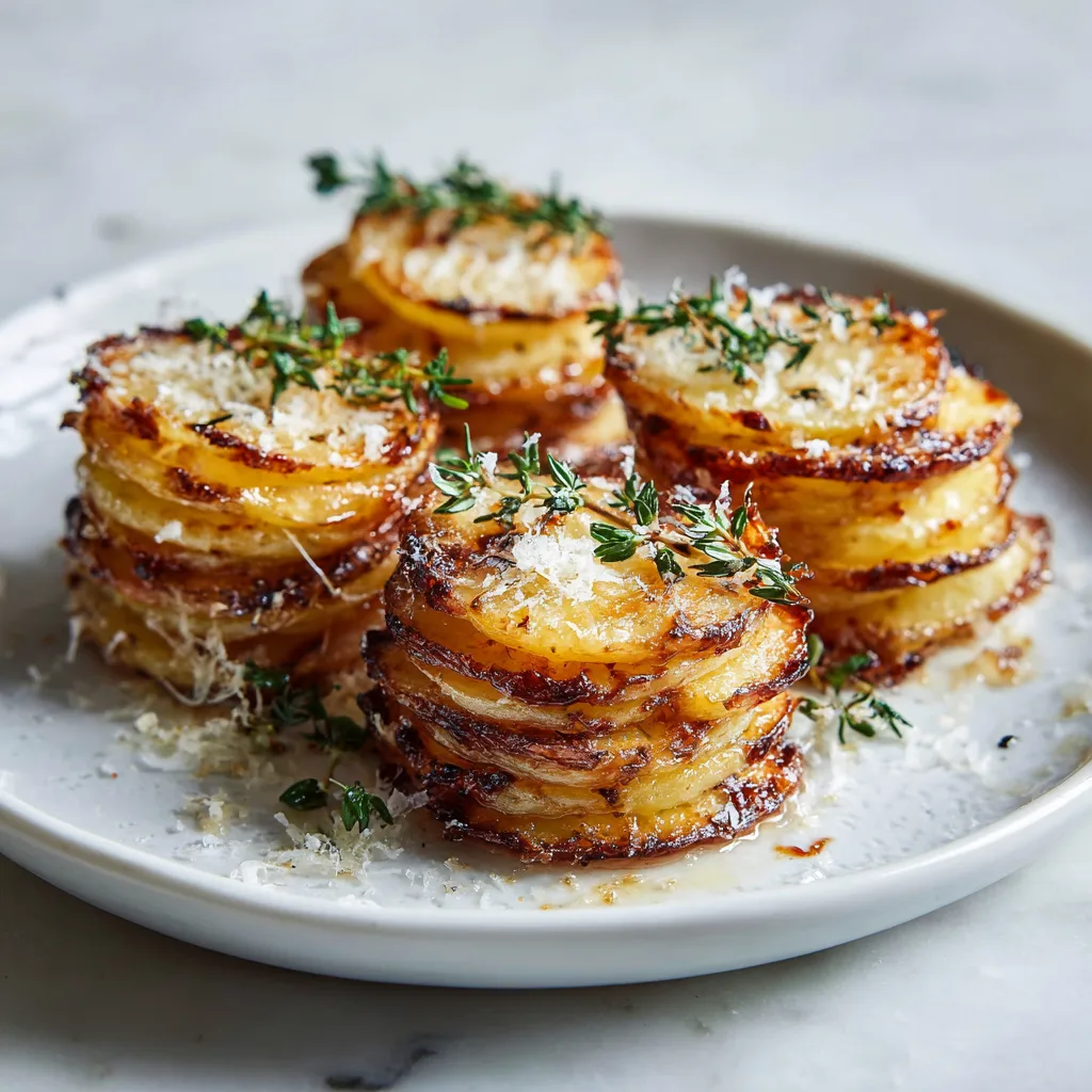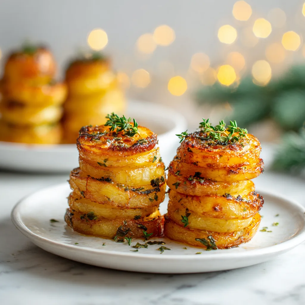Crispy layered potato stacks baked with garlic butter, herbs, and Parmesan for a cozy holiday side dish.