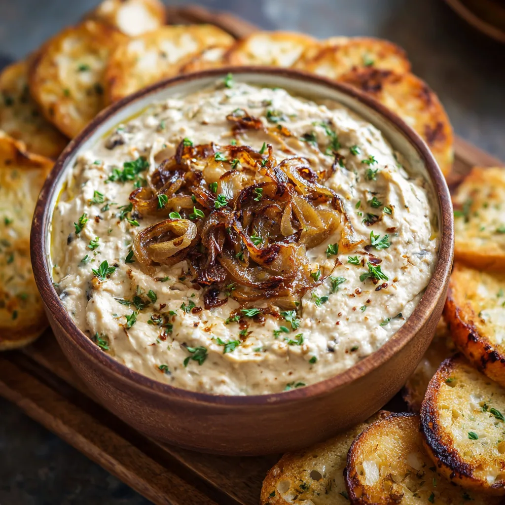 A rich, creamy onion dip made with deeply caramelized onions, fresh herbs, and a smooth sour cream base.