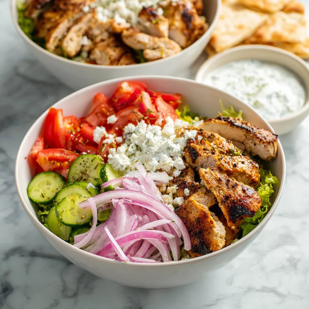Greek-inspired bowls work particularly well because they rely on bold seasoning rather than heavy sauces. Lemon, garlic, oregano, and olive oil infuse the chicken with flavor, while crisp vegetables provide contrast and texture.