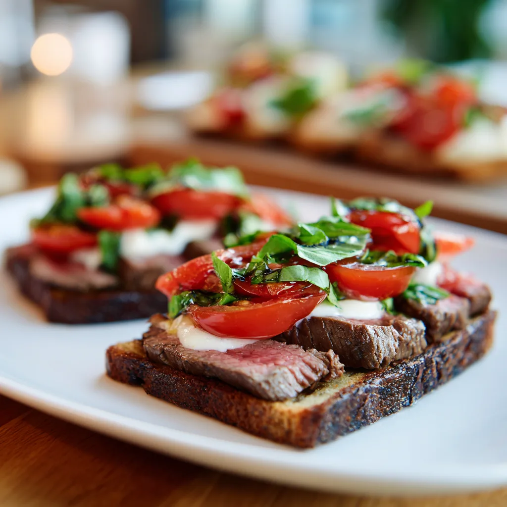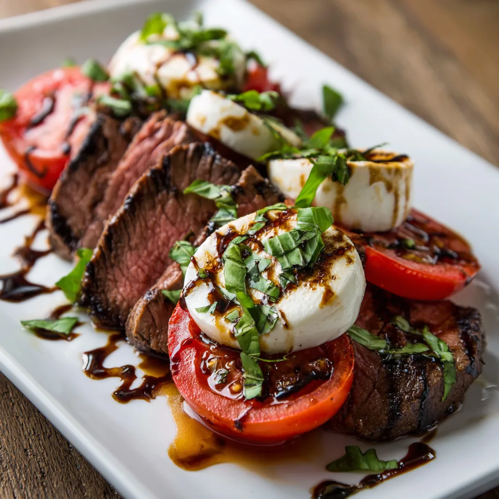 The final touch is a rich, glossy balsamic dressing, lightly sweet and tangy, tying every component together. Each bite delivers contrast: warm steak against cool mozzarella, juicy tomatoes against charred beef, and bright herbs cutting through savory richness.