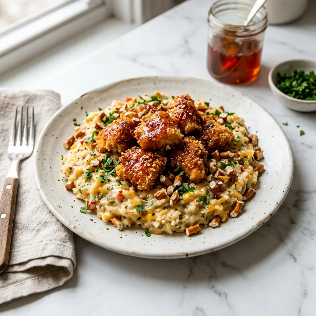This dish succeeds because of its contrast. The crunchy exterior of the chicken pairs beautifully with the soft, creamy rice underneath. The hot honey glaze ties everything together, coating each bite with a glossy, flavorful finish.