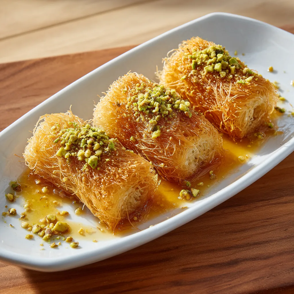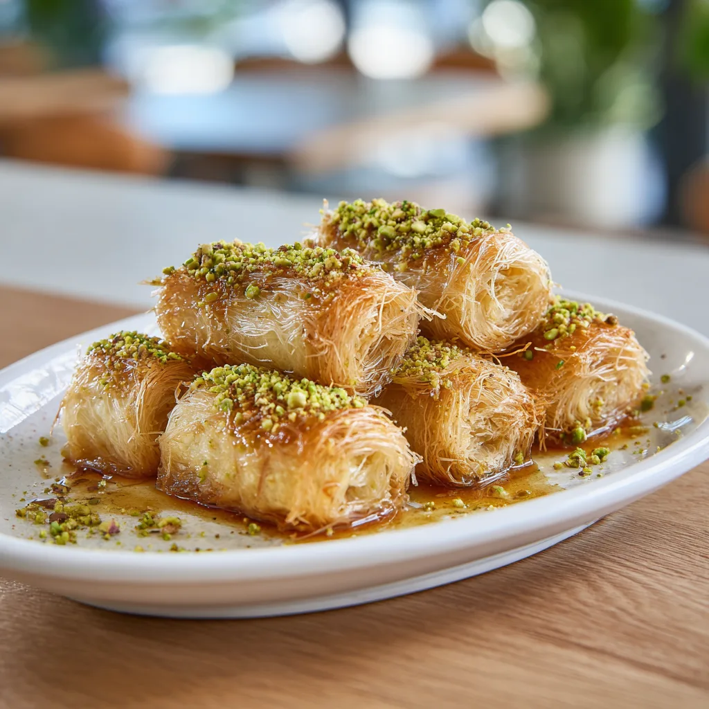 Kataifi is famous for its golden, crispy exterior and soft, syrupy interior. Traditionally filled with nuts such as walnuts or pistachios, it’s baked until deeply golden, then soaked in warm syrup infused with citrus and aromatics. The contrast of textures is what makes kataifi unforgettable.