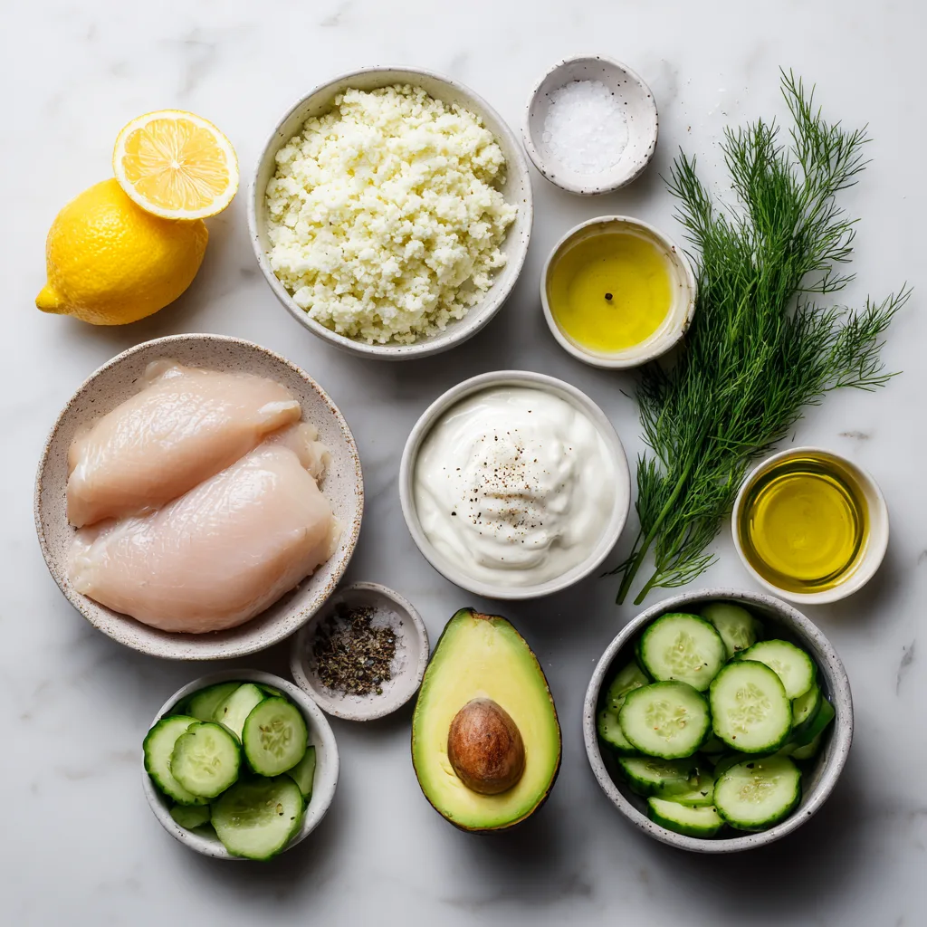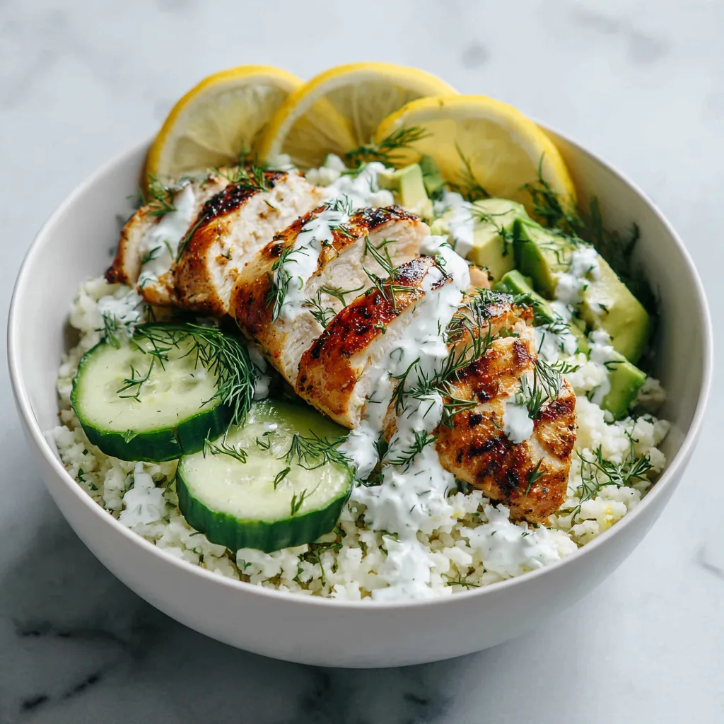 The star of the dish is juicy grilled chicken marinated in lemon, garlic, and fresh dill. Served over cauliflower rice with crunchy cucumbers and creamy avocado, the result is a balanced bowl that feels refreshing yet filling.