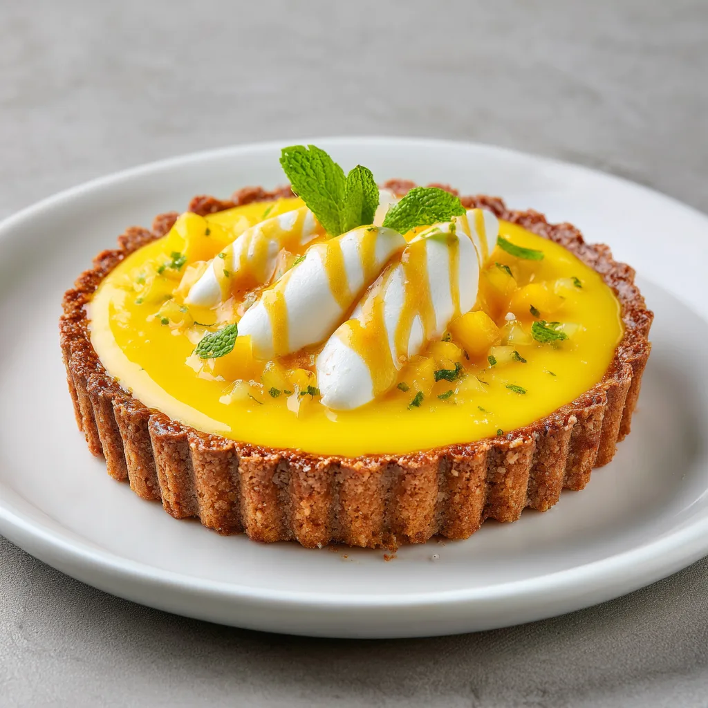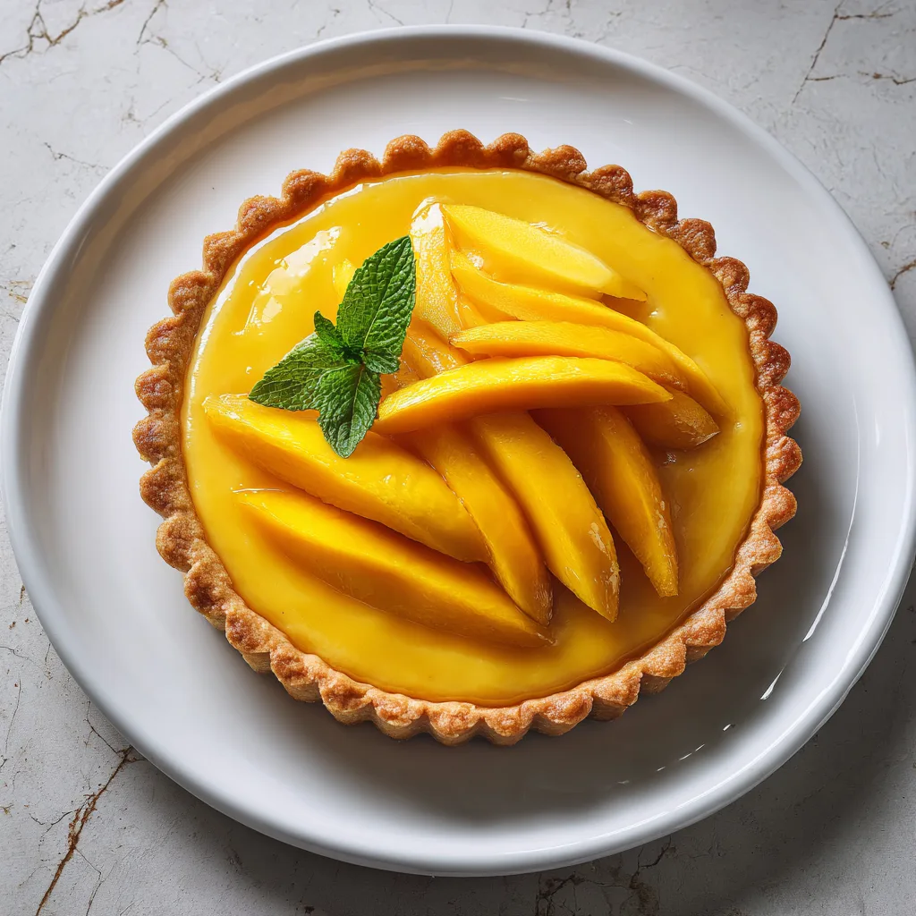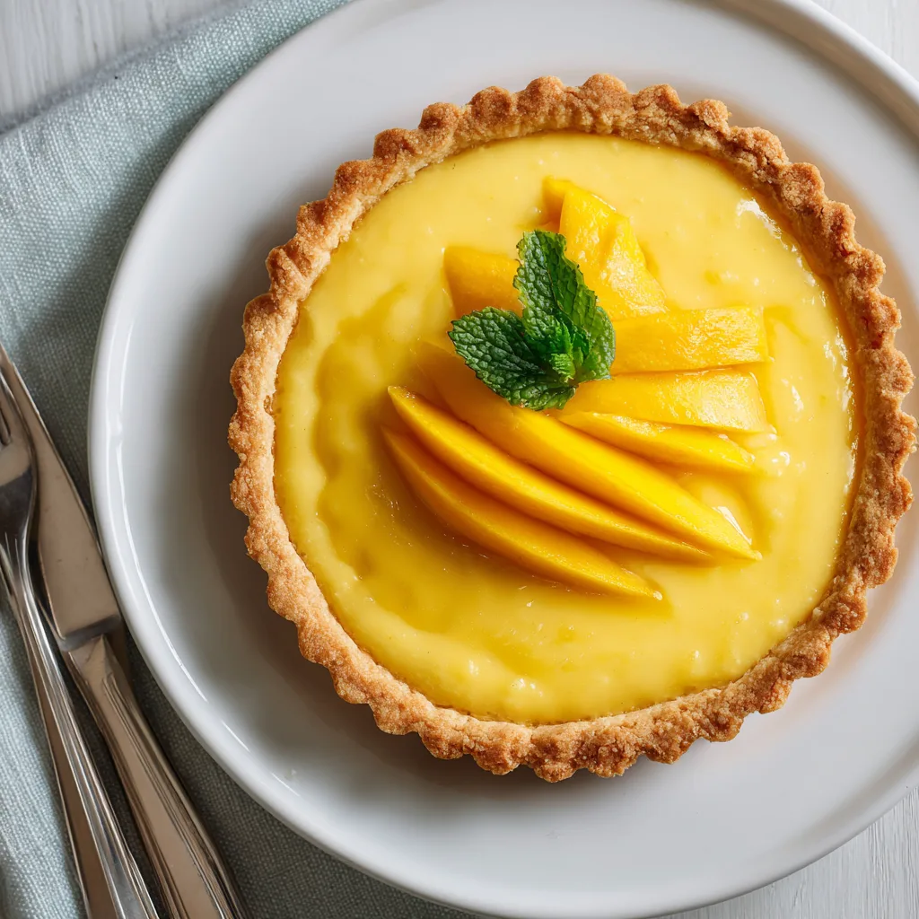 The crust is crisp and buttery, providing contrast to the silky mango curd. The filling is smooth, bright, and gently tangy, with mango flavor shining through without overpowering sweetness.
