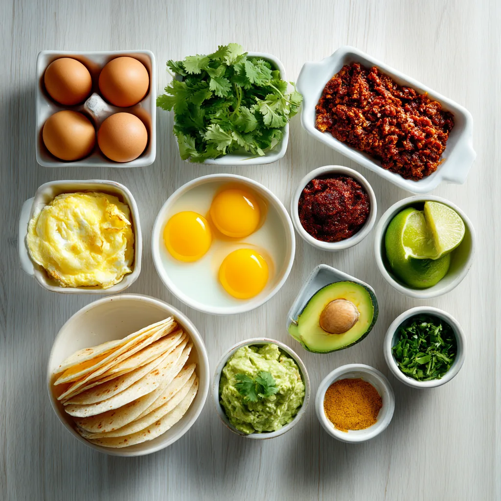 - Assemble tortillas, chorizo, avocado, egg, and sauce.
