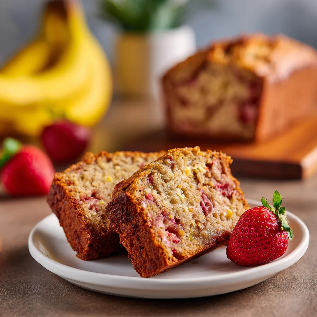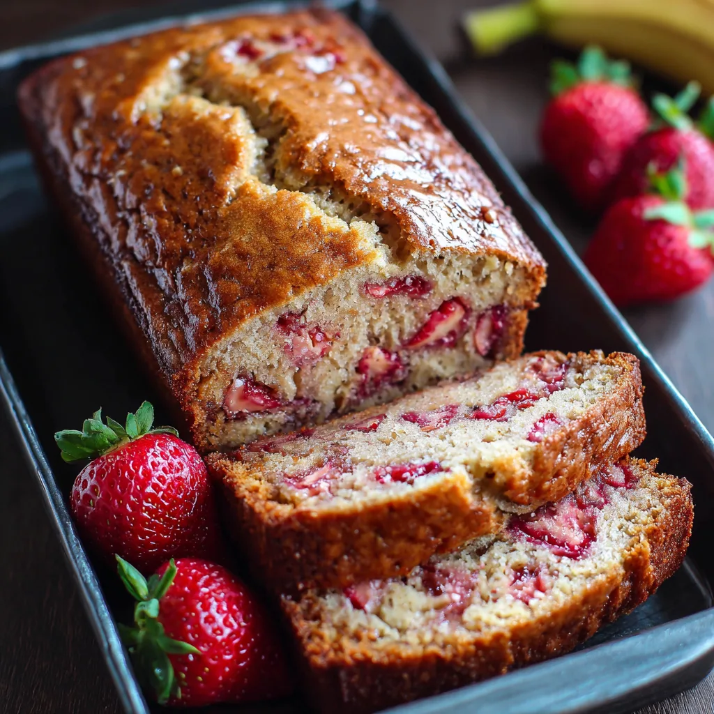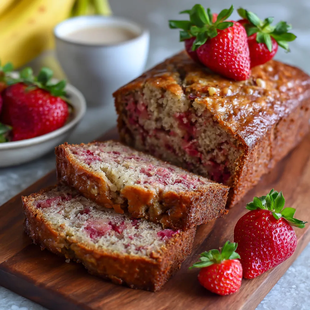 Moist and flavorful banana bread loaded with fresh strawberries, perfect for breakfast, snacks, or dessert.