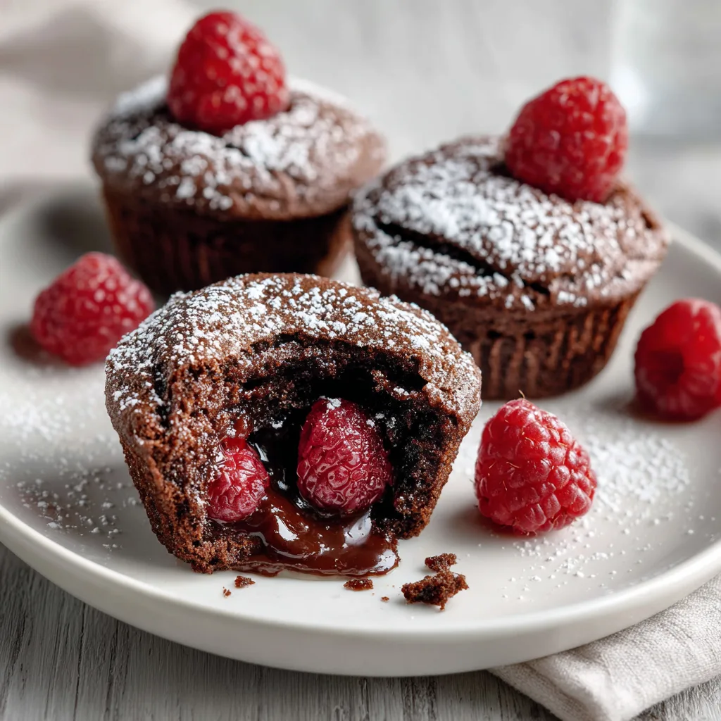 Decadent chocolate cupcakes with a gooey molten raspberry center, perfect for indulgent desserts and special occasions.