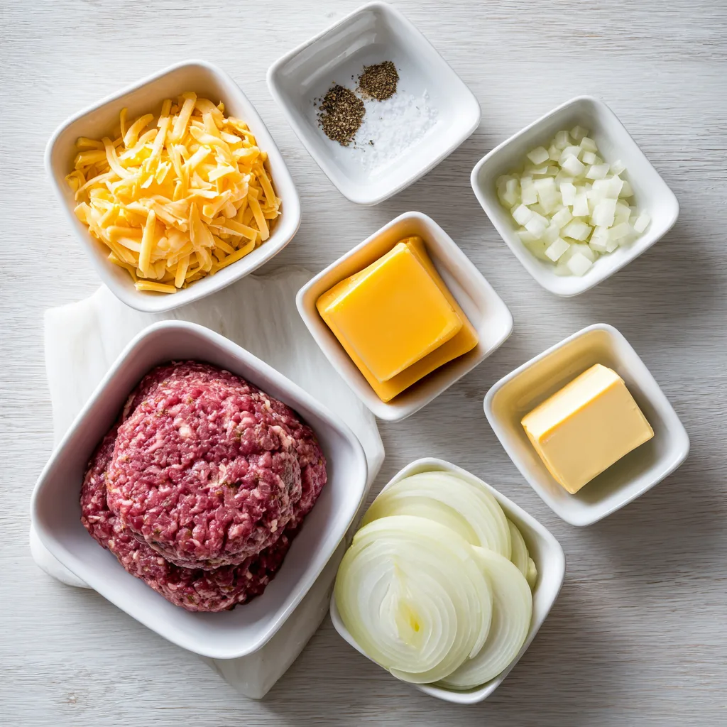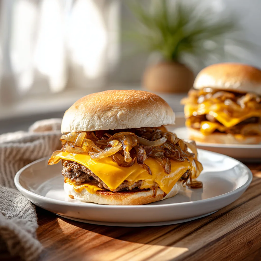 - Assemble by placing one cheesy patty on a plate, top with caramelized onions, then stack another cheesy patty on top — cheese sides facing outward to act as “buns.”