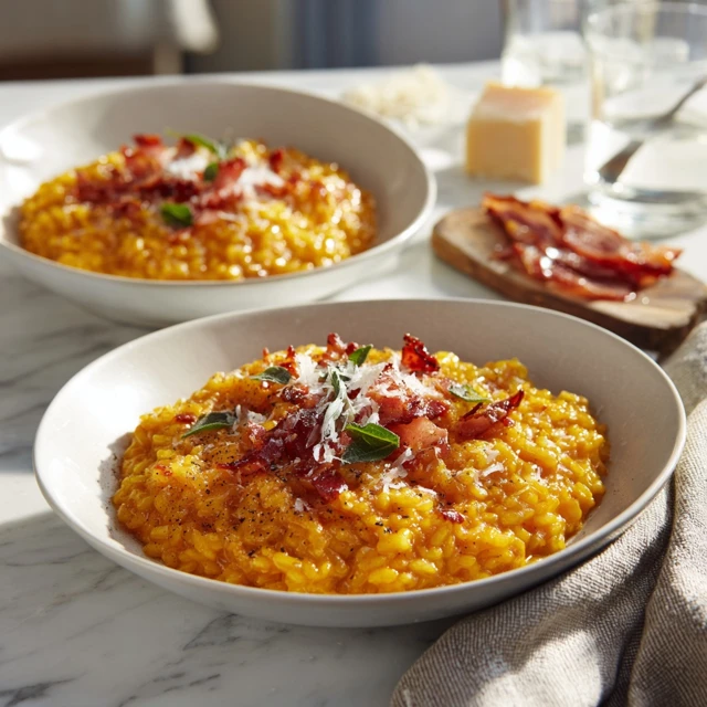 Creamy pumpkin risotto enriched with crispy bacon and savory Parmesan cheese.