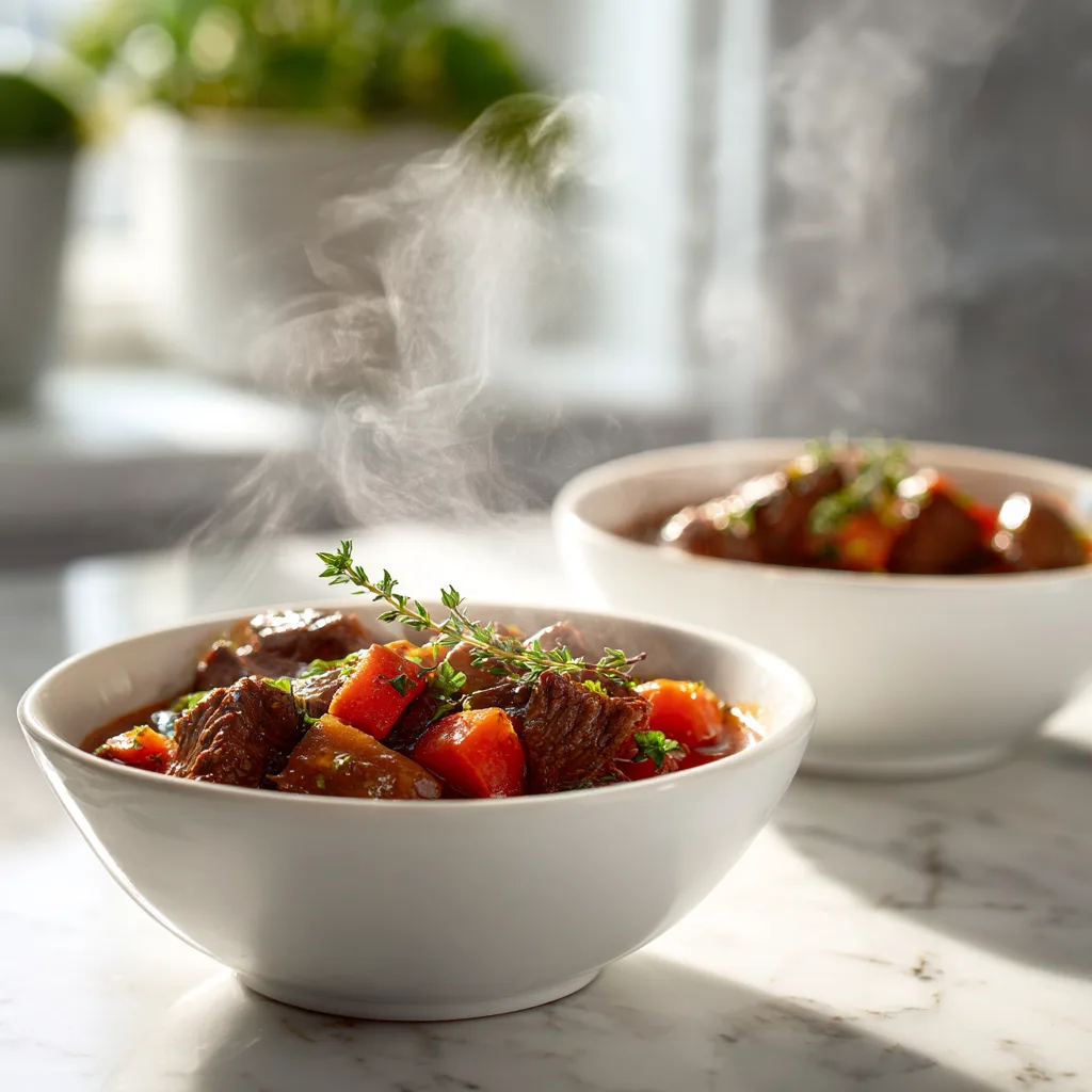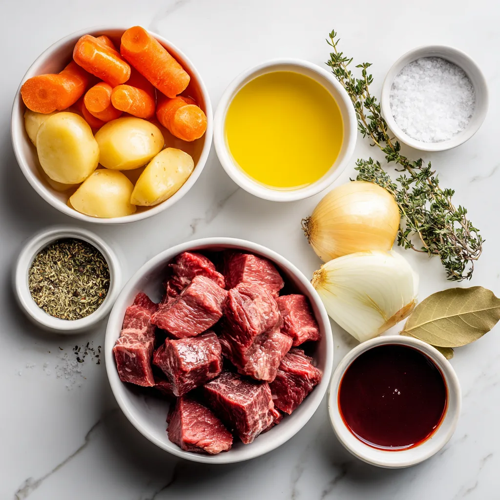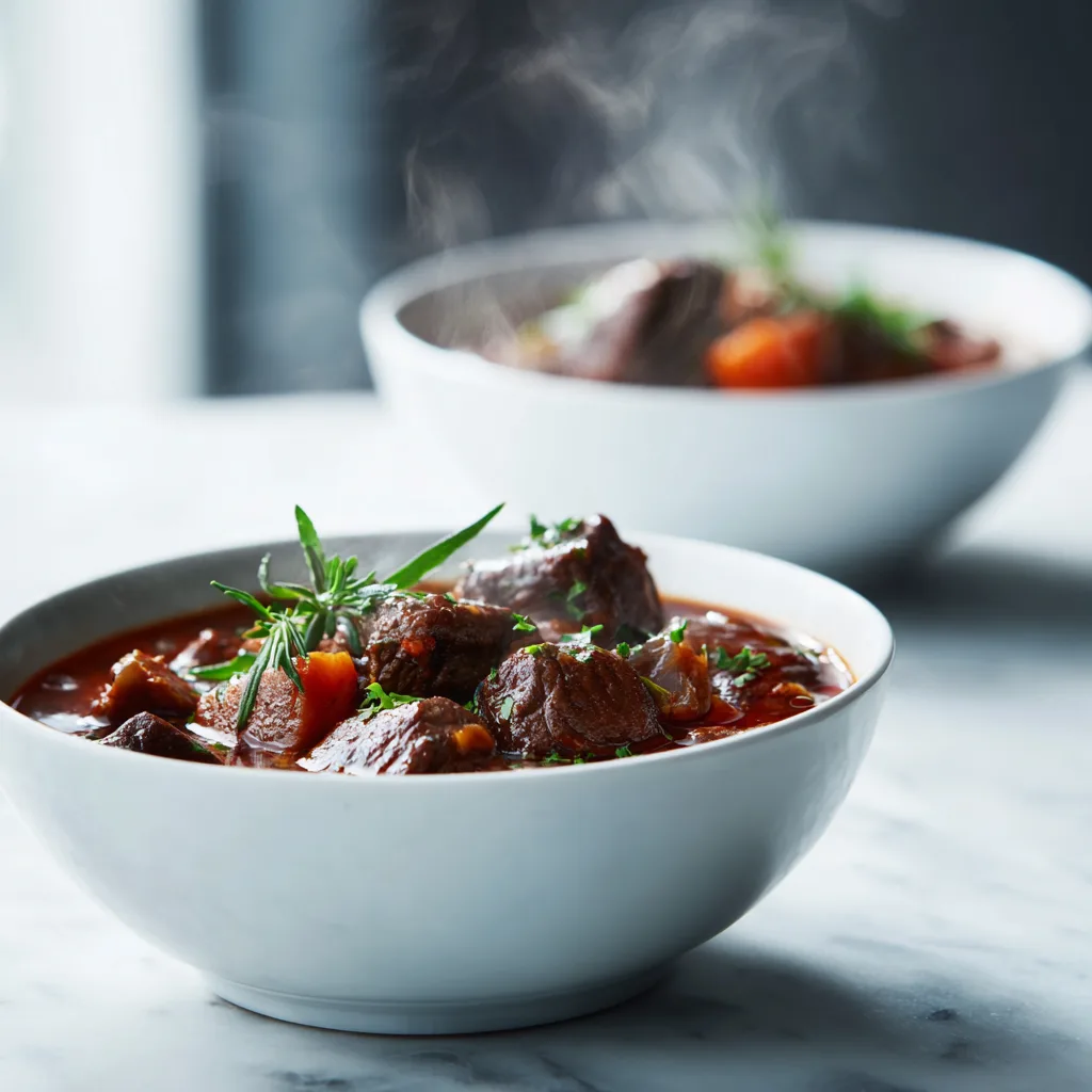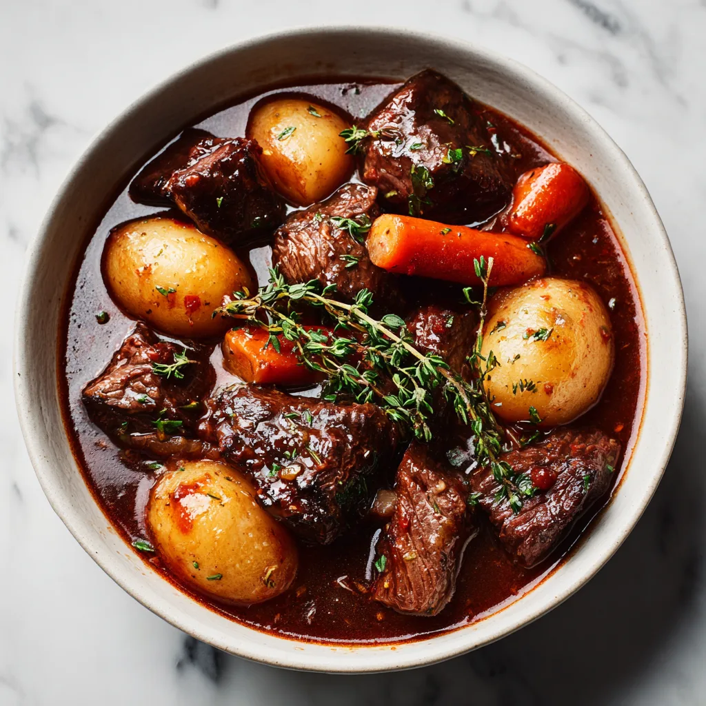 This recipe is built on simple ingredients transformed by time. Beef chuck slowly braises in red wine and broth, absorbing deep flavor while becoming melt-in-your-mouth tender. Potatoes and carrots add heartiness and natural sweetness, while herbs bring balance and aroma. The result is a stew that feels timeless, nourishing, and satisfying.