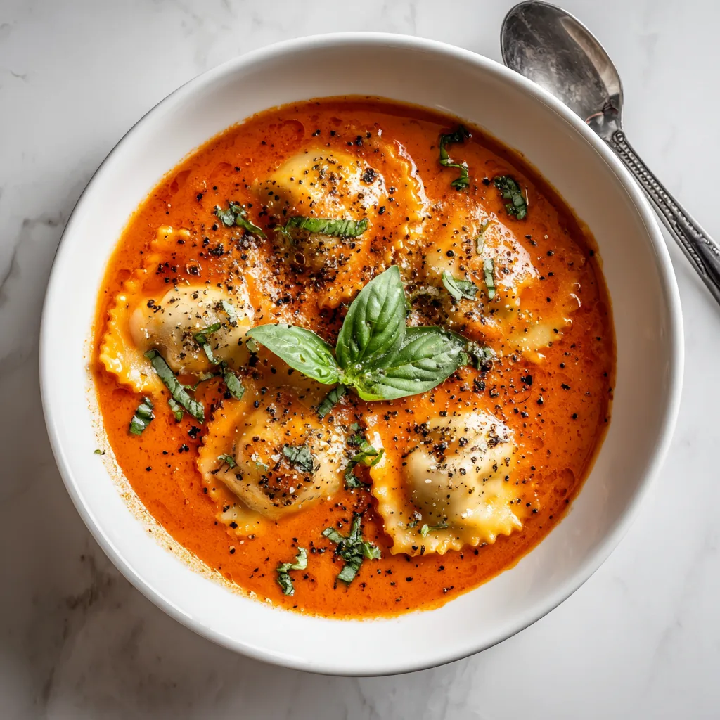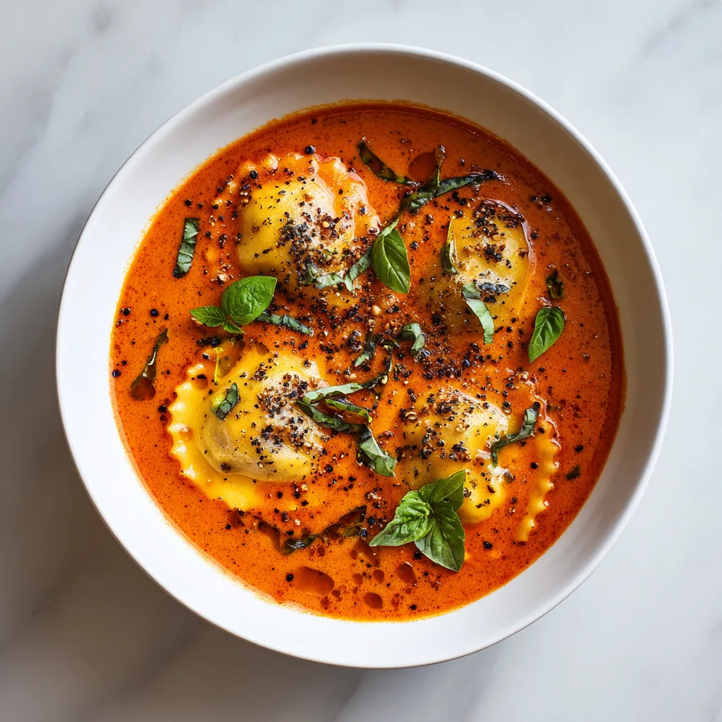 Creamy roasted red pepper soup with tender cheese ravioli for a comforting, hearty meal.