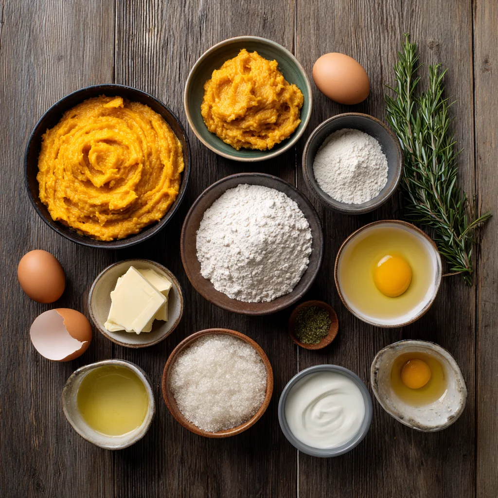 - In a large bowl, mix pumpkin purée, melted butter, egg, salt, and rosemary.