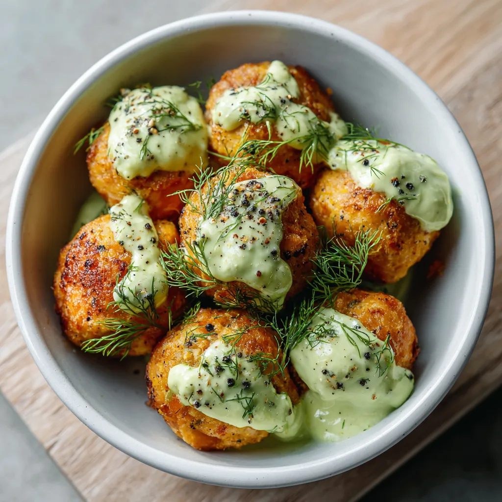 Crispy, tender salmon balls paired with a smooth and refreshing avocado sauce, perfect as an appetizer or healthy main dish.