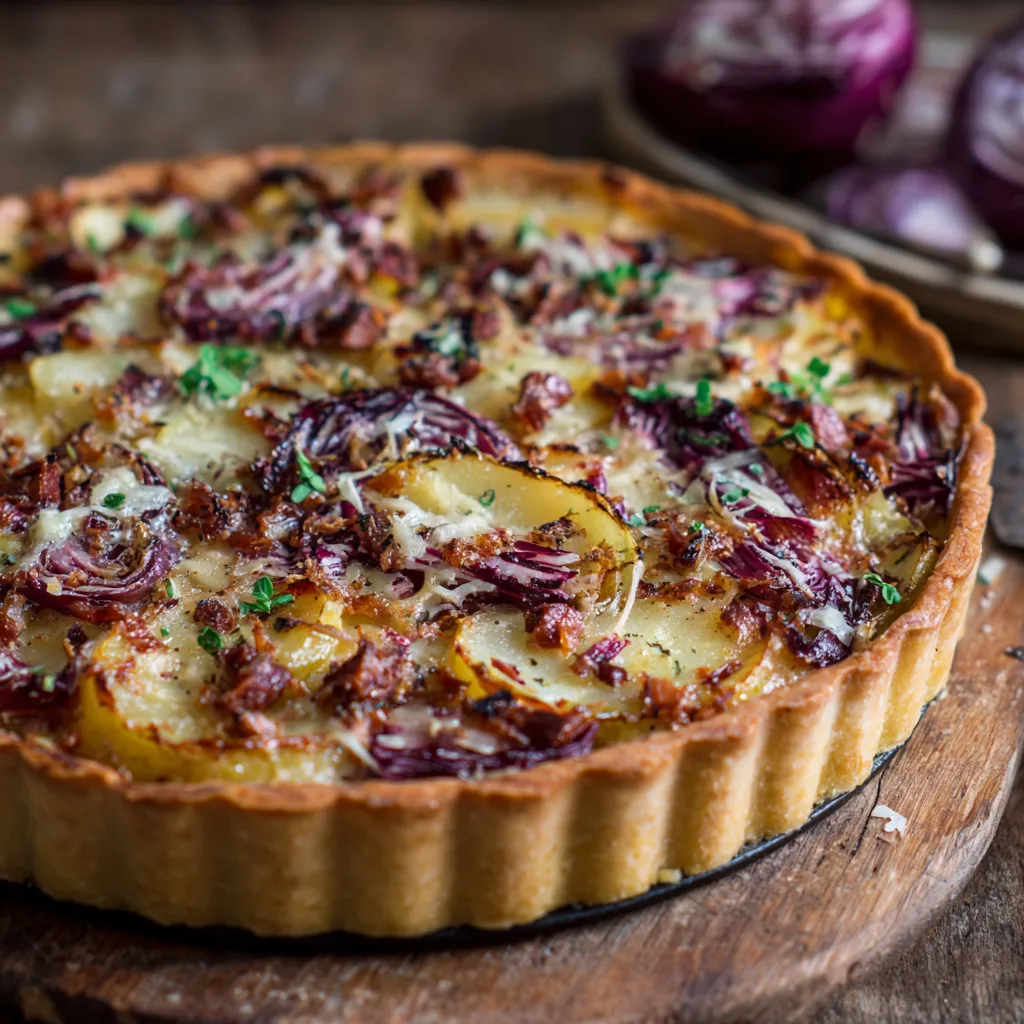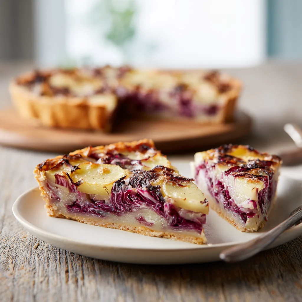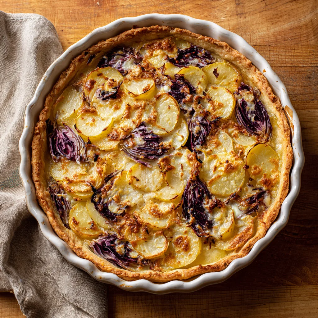 Savory Potato and Radicchio Tart is the kind of dish that feels effortlessly elegant while remaining deeply comforting. With its flaky crust, tender layers of potato, slightly bitter radicchio, and creamy savory filling, this tart turns humble ingredients into a satisfying meal that works just as well for dinner as it does for brunch or lunch.