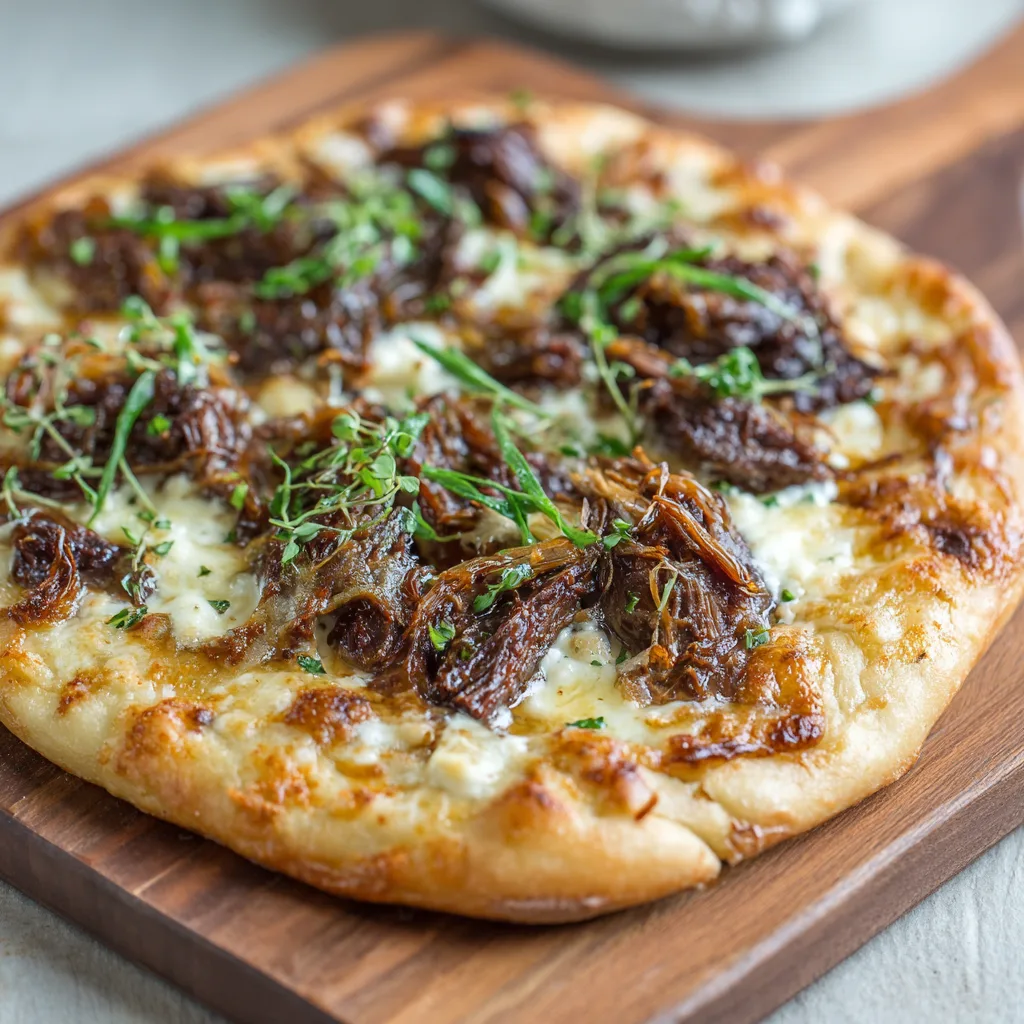 A gourmet pizza topped with tender braised short ribs and a creamy smoked gouda sauce, perfect for indulgent meals.