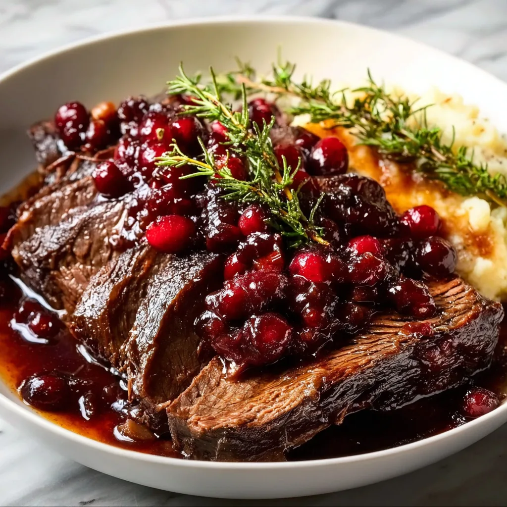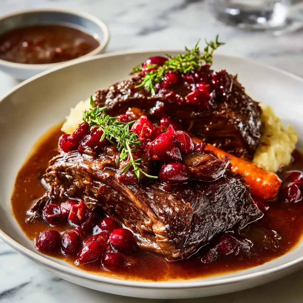 The slow braising process produces beef that is tender without shredding apart, allowing for clean slices and an attractive presentation. The glaze is glossy, rich, and balanced, with cranberry providing brightness and balsamic adding depth and mild sweetness.