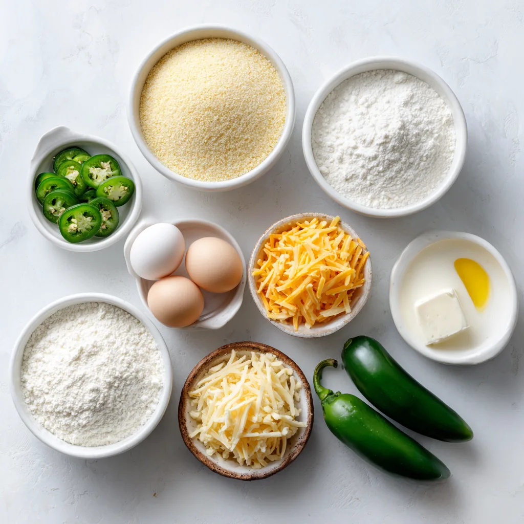 Cornmeal provides structure and texture, while flour keeps the crumb soft and prevents excessive crumbling. Buttermilk is essential for moisture and subtle tang, reacting with baking powder to create a light interior. Butter adds richness, while jalapeños deliver controlled heat that spreads evenly throughout the batter.