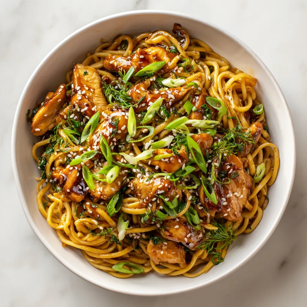 A quick and flavorful noodle dish made with tender chicken and a sticky garlic soy sauce, perfect for busy weeknights.