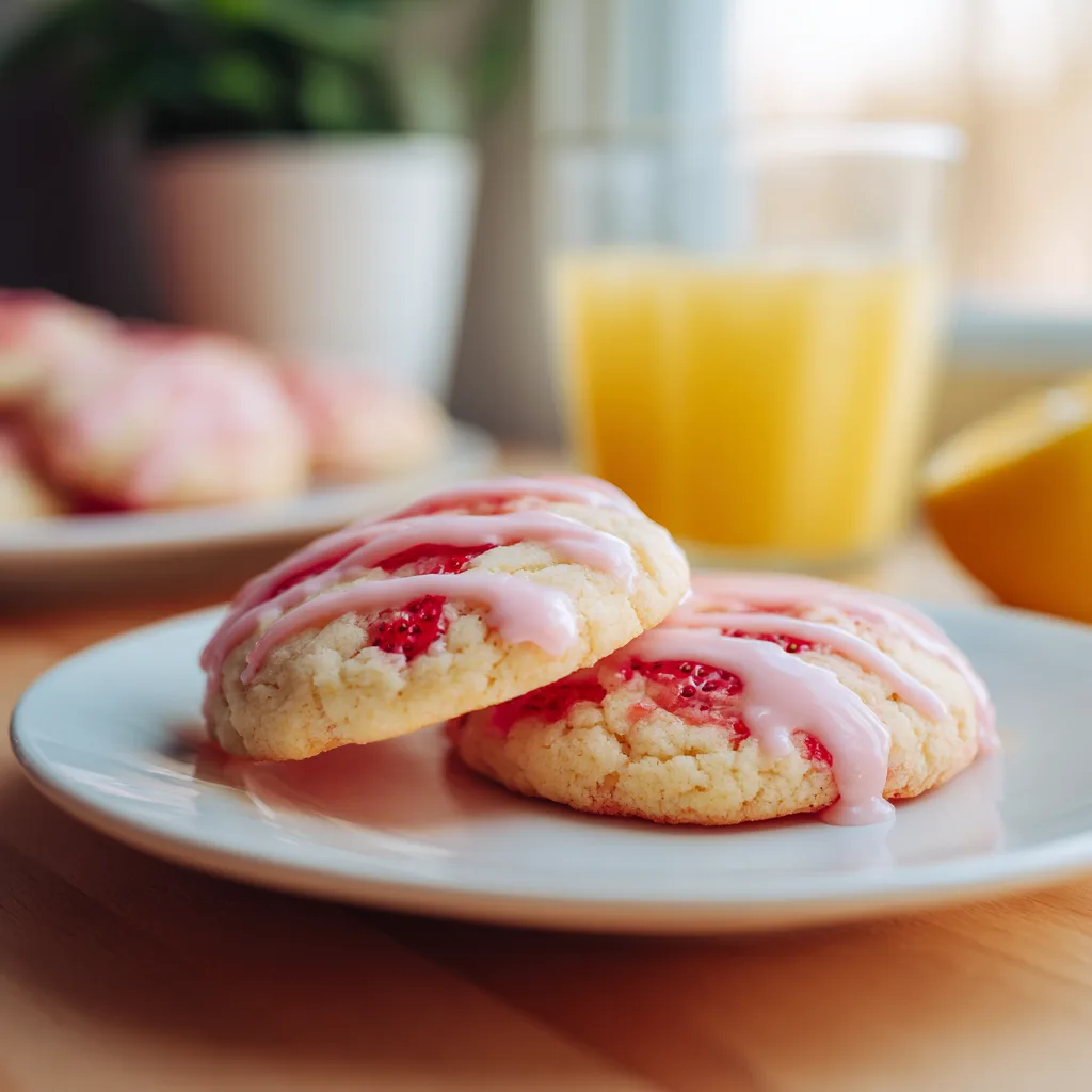 Soft, chewy cookies bursting with fresh lemon zest and sweet strawberries, topped with a bright lemon glaze.