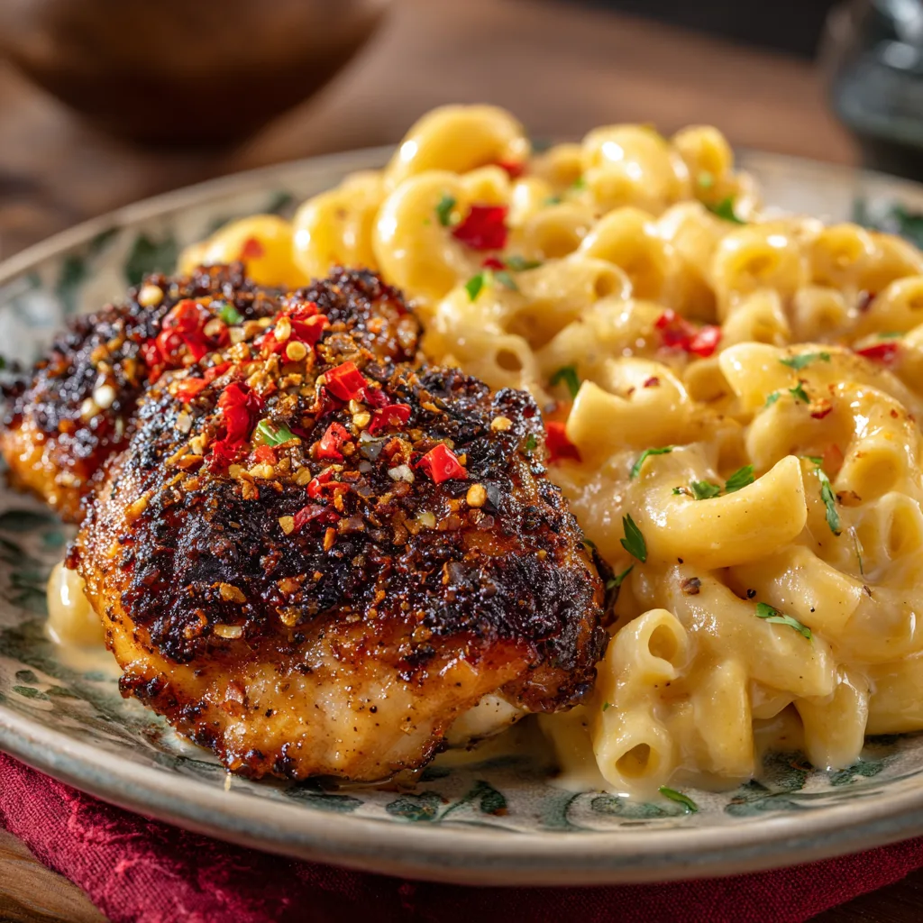 Sweet and Spicy Honey Pepper Chicken with Creamy Mac and Cheese