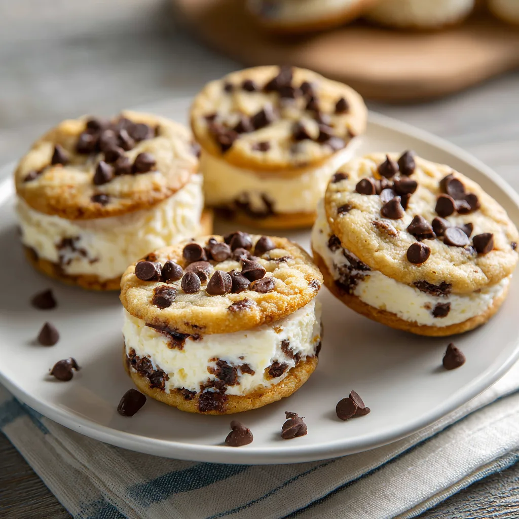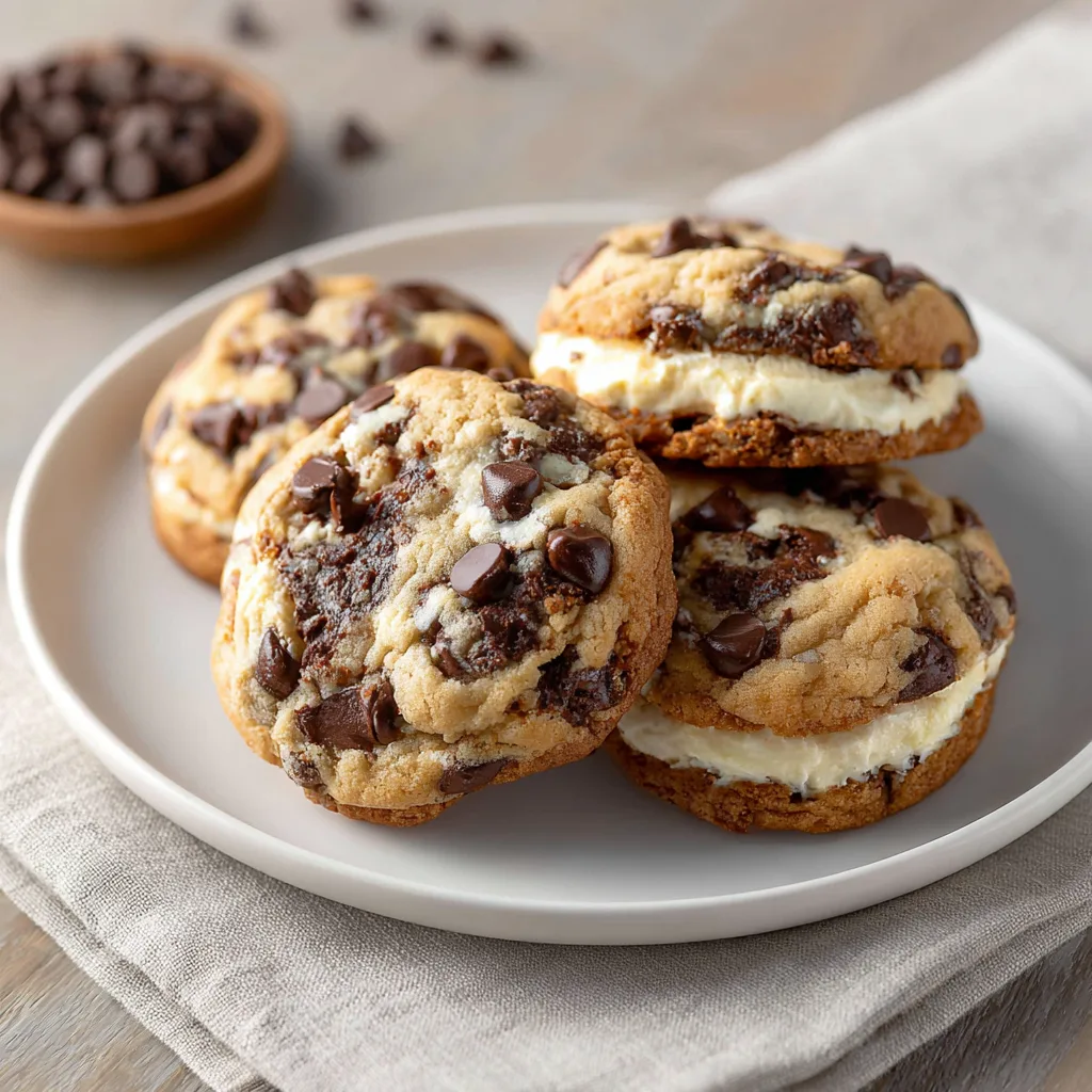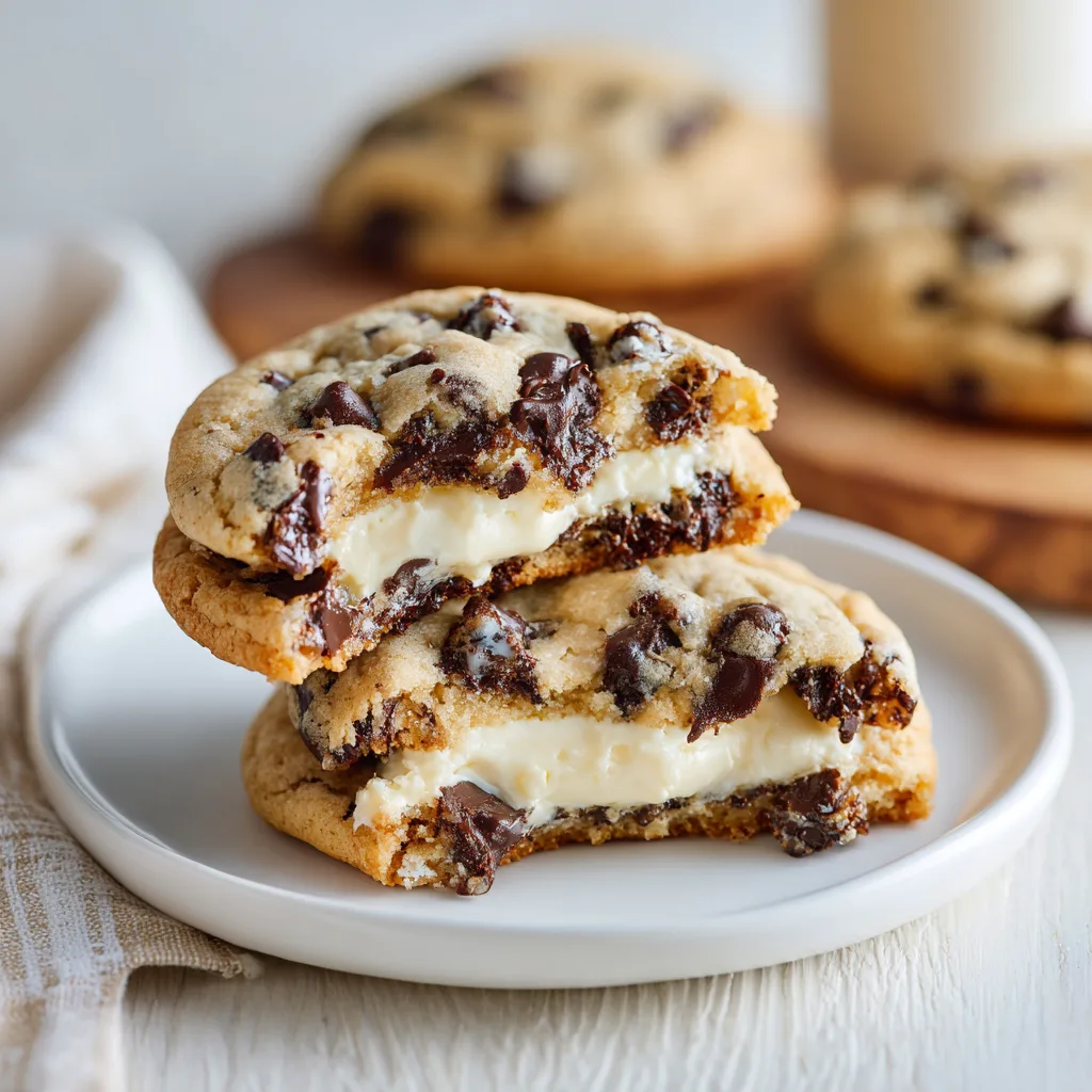 Soft and chewy chocolate chip cookies filled with creamy cheesecake for an indulgent dessert experience.
