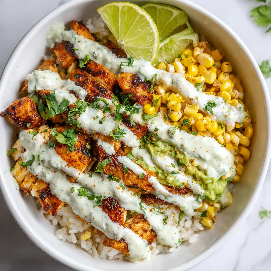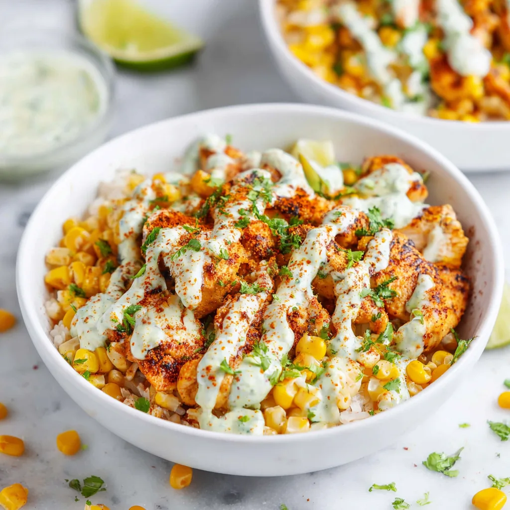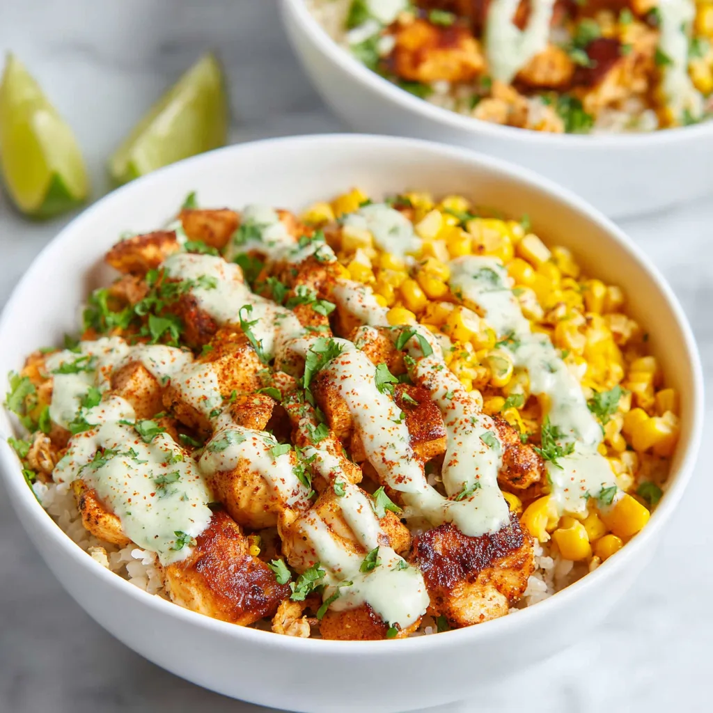 - Assemble bowls by layering rice, chicken, and street corn.