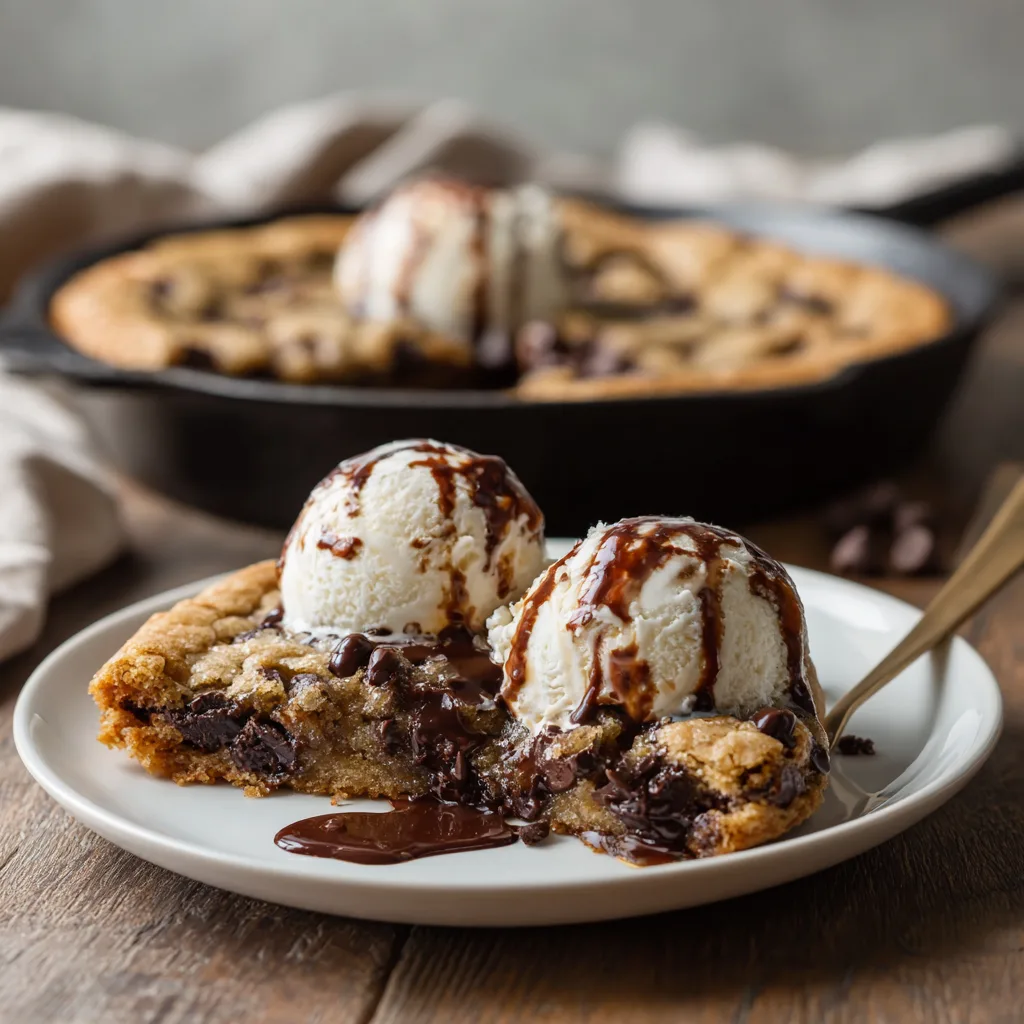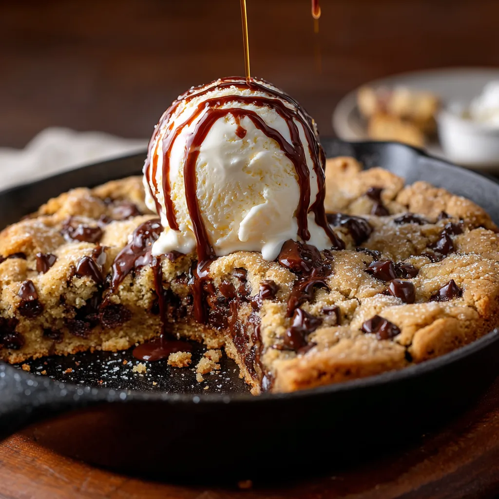 A warm, deep-dish chocolate chip cookie baked in a skillet with crispy edges and a gooey, melty center, perfect for sharing.