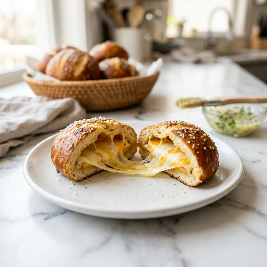This recipe combines three types of cheese for maximum melt and flavor, coats the bread in a crunchy pretzel crust, and finishes everything with a buttery garlic glaze. The result is crispy on the outside, gooey on the inside, and packed with savory goodness in every bite.