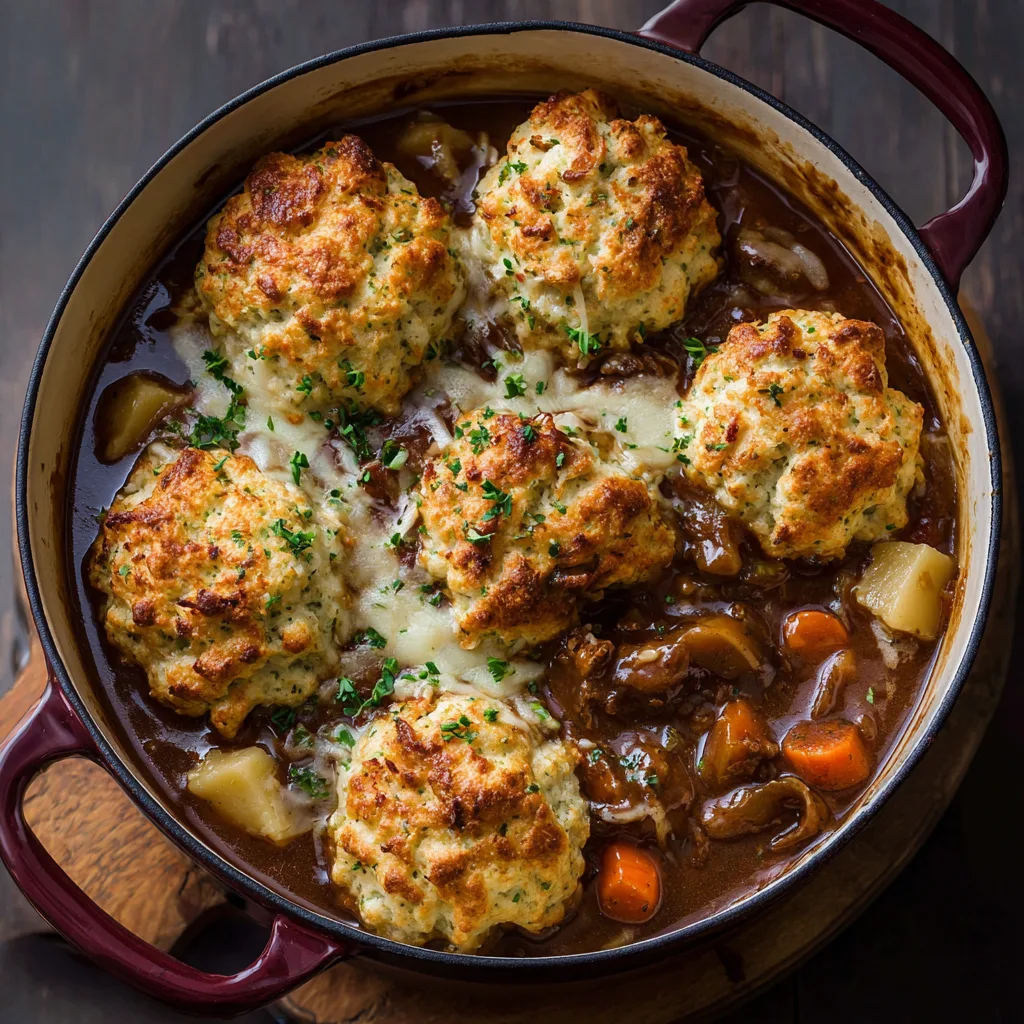 - Fluffy cheddar dumplings on top