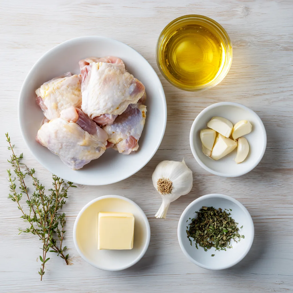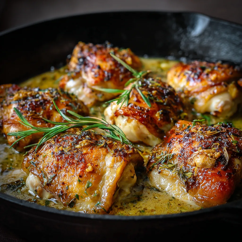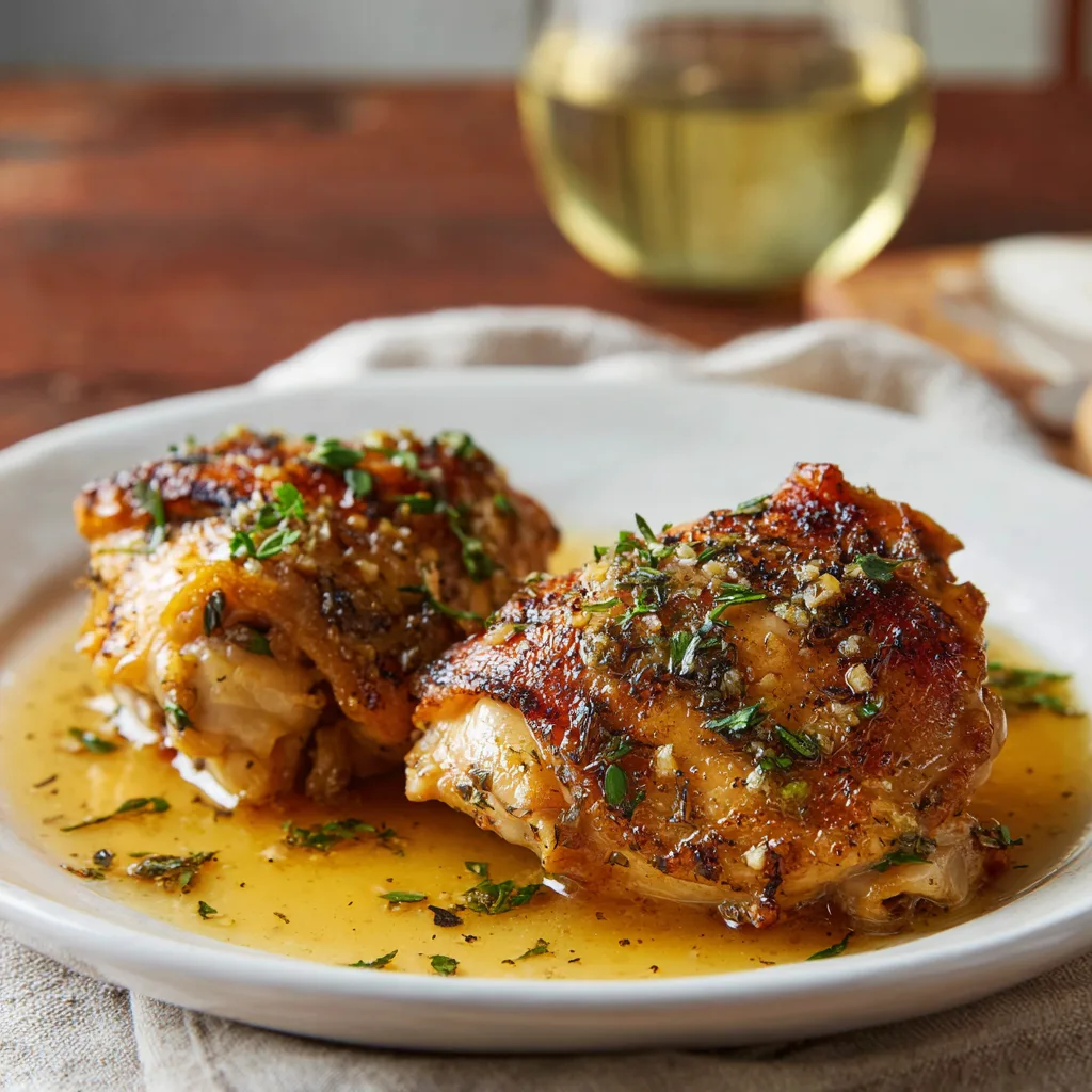 Juicy chicken thighs simmered in a rich garlic and white wine sauce, perfect for an elegant yet easy dinner.