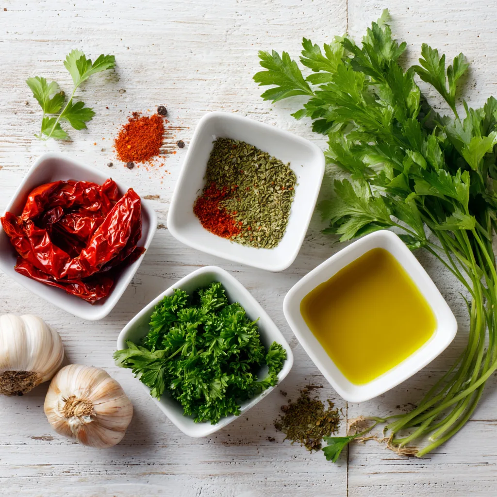 A bold, herb-packed red chimichurri sauce with smoky depth and zesty brightness, perfect for grilled meats, vegetables, and marinades.